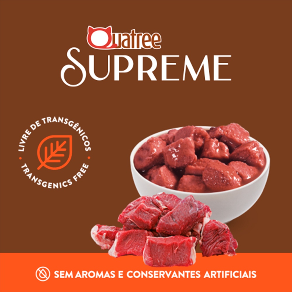 Sache Quatree Supreme Ração úmida para Gatos Castrados Caixa com 20un de 85g cada Quatree Supreme Sachê Gatos Adultos é uma refeição completa e balanceada para ser servida todos os dias. Feito com ingredientes selecionados cozidos no vapor e com textura macia, proporciona uma experiência diferenciada na alimentação do seu pet. - INGREDIENTES DE ORIGEM ANIMAL - SAÚDE INTESTINAL - PELE E PELOS SAUDÁVEIS COMPOSIÇÃO BÁSICA: FRANGO: Carne mecanicamente separada de aves (mín. 8%), fígado de aves, fígado de suíno, plasma sanguíneo desidratado de bovino, farinha de vísceras de aves, banha refinada, hidrolisado de fígado de suíno, farinha de trigo, óleo refinado de peixe, água, goma xantana, celulose em pó, parede celular de levedura (mín. 0,1%), zeólita, taurina, caramelo I, retinol (vit. A), cianocobalamina (vit. B12), D-pantotenato de cálcio (vit. B5), cloridrato de tiamina (vit. B1), riboflavina (vit. B2), cloridrato de piridoxina (vit. B6), biotina, colecalciferol (vit. D3), bissulfito sódico de menadiona (vit. K3), ácido fólico (vit. B9), ácido nicotínico (vit. B3), acetato de DL-alfa-tocoferol (vit. E), cloreto de sódio, carbonato de cálcio, cloreto de potássio, óxido de zinco, sulfato ferroso, óxido de ferro, sulfato de cobre (II), sulfato de manganês, iodato de cálcio e selenito de sódio. EVENTUAIS SUBSTITUTIVOS Plasma sanguíneo desidratado de suíno, pulmão de bovino, pulmão de suíno, amido de mandioca, farinha de carne e ossos de suíno, óleo de canola refinado e óleo de linhaça. CARNE: Carne de bovino (mín. 1%), carne mecanicamente separada de aves, fígado de aves, fígado de suíno, plasma sanguíneo desidratado de bovino, farinha de vísceras de aves, banha refinada, hidrolisado de fígado de suíno, farinha de trigo, óleo refinado de peixe, água, goma xantana, celulose em pó, parede celular de levedura (mín. 0,1%), zeólita, taurina, caramelo I, retinol (vit. A), cianocobalamina (vit. B12), D-pantotenato de cálcio (vit. B5), cloridrato de tiamina (vit. B1), riboflavina (vit. B2), cloridrato de piridoxina (vit. B6), biotina, colecalciferol (vit. D3), bissulfito sódico de menadiona (vit. K3), ácido fólico (vit. B9), ácido nicotínico (vit. B3), acetato de DL-alfa-tocoferol (vit. E), cloreto de sódio, carbonato de cálcio, cloreto de potássio, óxido de zinco, sulfato ferroso, óxido de ferro, sulfato de cobre (II), sulfato de manganês, iodato de cálcio e selenito de sódio. EVENTUAIS SUBSTITUTIVOS Plasma sanguíneo desidratado de suíno, pulmão de bovino, pulmão de suíno, amido de mandioca, farinha de carne e ossos de suíno, óleo de canola refinado e óleo de linhaça.