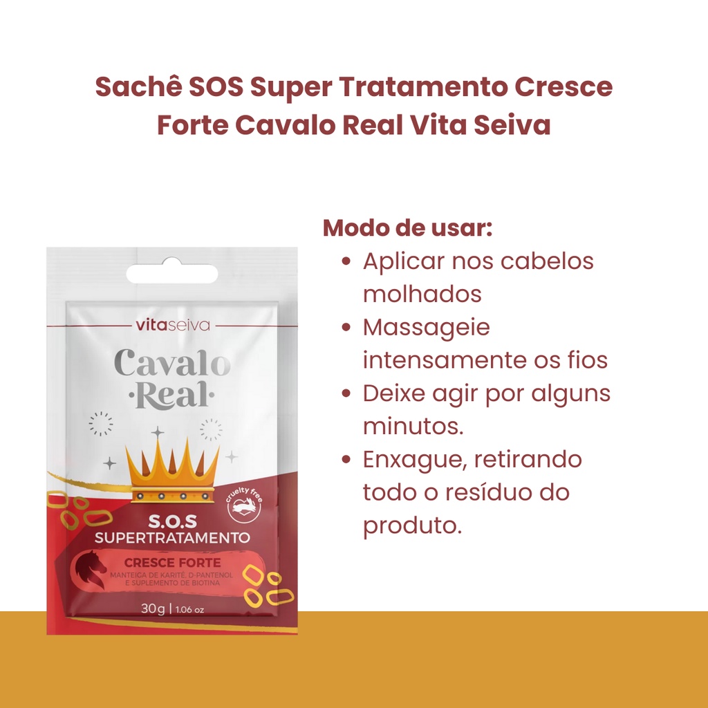 Ele é superconcentrado e traz o que seuscabelos precisam em uma únicaaplicação. Enriquecido com Biotina e Óleode Rícino, deixa os cabelos brilhantes emacios, além de deixar os fios maisencorpados e resistentes. Trata as pontasbipartidas, auxilia no crescimento dasmadeixas e elimina o frizz. Tudo isso emO Sachê SOS Tratamento de ShockCavalo Real é perfeito para quem nãotem muito tempo e deseja uma super-hidratação em poucos minutos!apenas 3 minutos! Nutre a fibra capilar com vitaminas e aminoácidos, e prepara o cabelo para o crescimento forte e saudável. Modo de usar: Aplique o SOS Tratamento nos cabelos molhados, massageando suavemente. Deixe agir por alguns minutos e enxague.