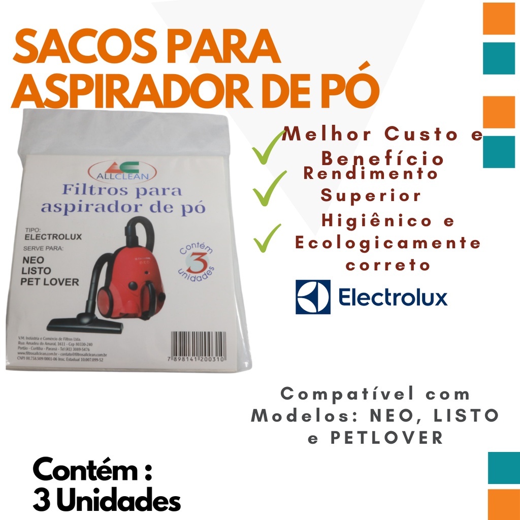 **Venda somente do saco descartável, imagem do aspirador é meramente ilustrativa. Sacos descartáveis para aspirador de pó compatível com a marca Electrolux do modelo NEO 10, NEO 11, LISTO, PET LOVER, contém 3 unidades no pacote. Compatível com : Marca : ELECTROLUX Modelo: NEO 10, NEO 11, LISTO, PET LOVER (Foto do modelo disponível) * Melhor custo-benefício; * Preserve seu aspirador de pó e aumente a vida útil trocando com mais frequência os sacos descartáveis; * Filtro novo aumenta o poder de sucção do aspirador; * Retire seu aspirador do armário e tenha mais praticidade na limpeza, sem dor nas costas e corpo; * Aproveite os benefícios do seu eletrodoméstico.Você receberá: 01 pacote com 03 sacos de filtros descartáveis ***DEVOLUÇÃO*** Devolução garantida se não for compatível com seu aspirador de pó, mas para não ocorrer devolução por favor verifique a marca e modelo do seu aspirador ou é claro, você pode me mandar suas dúvidas no campo de perguntas que responderei com maior prazer. Não deixe de usar seu eletrodoméstico por falta de algum acessório. Aproveite a praticidade que eles nos proporcionam no dia a dia.