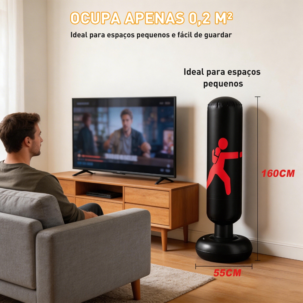 Material premium e estabilidade reforçada – Fabricado em PVC espesso e flexível, com tecnologia antivazamento que mantém a pressão por mais tempo. A base larga de 55 cm de diâmetro oferece excelente estabilidade durante golpes intensos, evitando tombamento. Por não conter partes rígidas, é totalmente seguro para adultos e crianças. Treino versátil para diversas modalidades – Ideal para boxe, muay thai, kickboxing, taekwondo, crossfit e treinos funcionais. Ajuda a desenvolver condicionamento físico, agilidade, reflexos, coordenação motora e resistência muscular, além de contribuir para a queima calórica e alívio do estresse. Montagem simples e portabilidade – O enchimento pode ser feito com bomba manual, elétrica ou até mesmo pela boca em poucos minutos. Após o uso, o produto esvazia facilmente e pode ser dobrado para guardar em espaços pequenos, sendo perfeito para quem tem área reduzida ou deseja levar para diferentes locais. Adequado para toda a família e diversos ambientes – Indicado tanto para crianças quanto para adultos, promove treinos seguros e divertidos em casa. Não danifica pisos e pode ser utilizado em áreas internas, quintais, academias residenciais ou estúdios profissionais sem restrições. Design funcional com excelente custo‑benefício – Acabamento moderno nas cores preto e vermelho, aliando durabilidade e estética. O modelo é dobrável, portátil e acompanha garantia contra defeitos de fabricação, entregando alto desempenho por um valor acessível. Especificações Técnicas Altura total: 1,60 m Diâmetro da base: 55 cm Material: PVC espesso e flexível Cor :Preto com detalhes em vermelho Conteúdo da embalagem: 1 saco de pancada inflável (bomba e luvas não inclusos) Público‑alv: Adultos e crianças Armazenamento: Esvaziar, dobrar e guardar em local seco e arejado Limpeza: Pano úmido com sabão neutro