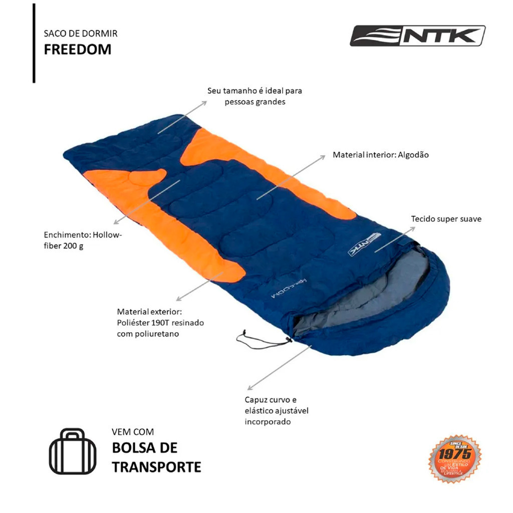 # Auto Equip # Seja bem-vindo(a)!!! --- Descrição: Saco de dormir Freedom NTK solteiro para temperatura entre de -3,5°C à -1,5°C Azul e Laranja Conheça o Freedom, saco de dormir do tipo misto da NTK! Os sacos de dormir têm a função de manter uma temperatura agradável durante uma noite de sono ou até mesmo num rápido cochilo. O Freedom da NTK é um saco de dormir do tipo misto, ou seja, parte envelope e outra sarcófago. Sua temperatura vai de -1,5°C a -3,5°C, sua confecção proporciona maior conforto e uma ótima sensação de descanso durante o uso. Vale destacar que seu tamanho é ótimo até mesmo para pessoas altas. Ele acompanha bolsa de transporte, capuz curvo e elástico ajustável incorporado, sem contar no zíper que percorre toda a sua extensão. Importante: o zíper fica localizado no lado direito do saco de dormir. Para ter toda a capacidade do saco de dormir, use em conjunto com isolante térmico. O produto pesa 1,5 kg, tem medidas de 2,10m x 75cm. Se você está procurando um saco de dormir com alta qualidade e excelente desempenho para tornar suas noites no camping mais quentes e confortáveis, conheça o Freedom da Nautika. RESISTÊNCIA - O Freedom é produzido em poliéster 190T resinado com poliuretano. MODELO MISTO - Esse saco de dormir é do tipo misto, ou seja, uma parte é envelope e a outra sarcófago. BOLSA DE TRANSPORTE - Acompanha bolsa para facilitar o transporte e a armazenagem do seu saco de dormir. AJUSTE LATERAL - O capuz desse modelo possui ajuste lateral para facilitar o conforto. O raio de temperatura: -1,5°C - CONFORTO -3,5°C - EXTREMO Informações gerais - Material interior: Algodão - Material exterior: Poliéster 190T resinado com poliuretano - Enchimento: Hollow-fiber 200g - Peso: 1,5kg - Medidas: 2,10m x 75cm - Marca: NTK Conteúdo da Embalagem: - 01 Saco de Dormir Freedom NTK - Azul/Laranja Importante - Garantia de 03 meses; - Pedidos aprovados até 12h00 de segunda a sexta será enviada no mesmo dia; - Enviamos em até 24h úteis; - Imagens meramente ilustrativas; - A cor do produto pode variar de acordo com a tela do seu smartphone ou computador; - Utilize o campo de "Perguntas e respostas" e esclareça suas dúvidas com nosso suporte técnico.