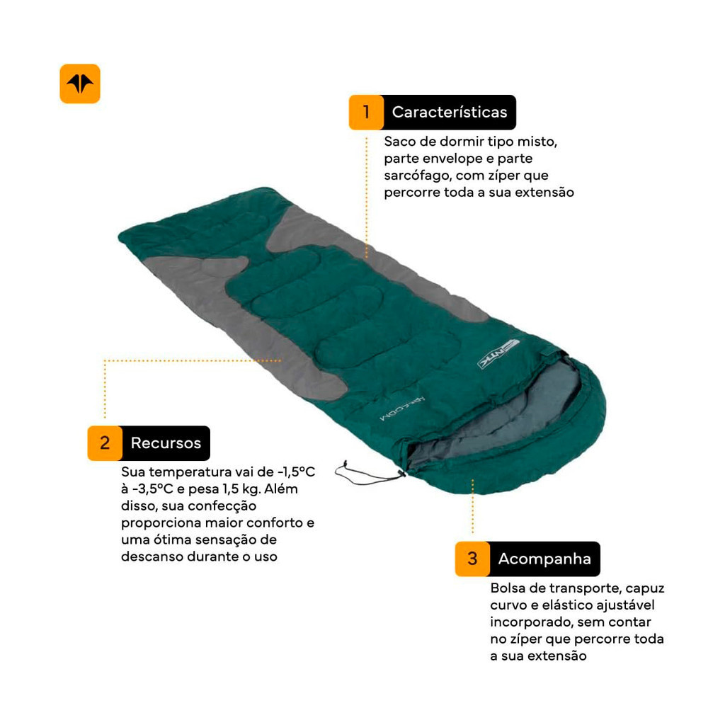 # Auto Equip # Seja bem-vindo(a)!!! --- Descrição: Saco de dormir Freedom NTK solteiro para temperatura entre de -3,5°C à -1,5°C Verde e Cinza Conheça o Freedom, saco de dormir do tipo misto da NTK! Os sacos de dormir têm a função de manter uma temperatura agradável durante uma noite de sono ou até mesmo num rápido cochilo. O Freedom da NTK é um saco de dormir do tipo misto, ou seja, parte envelope e outra sarcófago. Sua temperatura vai de -1,5°C a -3,5°C, sua confecção proporciona maior conforto e uma ótima sensação de descanso durante o uso. Vale destacar que seu tamanho é ótimo até mesmo para pessoas altas. Ele acompanha bolsa de transporte, capuz curvo e elástico ajustável incorporado, sem contar no zíper que percorre toda a sua extensão. Importante: o zíper fica localizado no lado direito do saco de dormir. Para ter toda a capacidade do saco de dormir, use em conjunto com isolante térmico. O produto pesa 1,5 kg, tem medidas de 2,10m x 75cm. Se você está procurando um saco de dormir com alta qualidade e excelente desempenho para tornar suas noites no camping mais quentes e confortáveis, conheça o Freedom da Nautika. RESISTÊNCIA - O Freedom é produzido em poliéster 190T resinado com poliuretano. MODELO MISTO - Esse saco de dormir é do tipo misto, ou seja, uma parte é envelope e a outra sarcófago. BOLSA DE TRANSPORTE - Acompanha bolsa para facilitar o transporte e a armazenagem do seu saco de dormir. AJUSTE LATERAL - O capuz desse modelo possui ajuste lateral para facilitar o conforto. O raio de temperatura: -1,5°C - CONFORTO -3,5°C - EXTREMO Informações gerais - Material interior: Algodão - Material exterior: Poliéster 190T resinado com poliuretano - Enchimento: Hollow-fiber 200g - Peso: 1,5kg - Medidas: 2,10m x 75cm - Marca: NTK Conteúdo da Embalagem: - 01 Saco de Dormir Freedom NTK - Verde/Cinza Importante - Garantia de 03 meses; - Pedidos aprovados até 12h00 de segunda a sexta será enviada no mesmo dia; - Enviamos em até 24h úteis; - Imagens meramente ilustrativas; - A cor do produto pode variar de acordo com a tela do seu smartphone ou computador; - Utilize o campo de "Perguntas e respostas" e esclareça suas dúvidas com nosso suporte técnico.