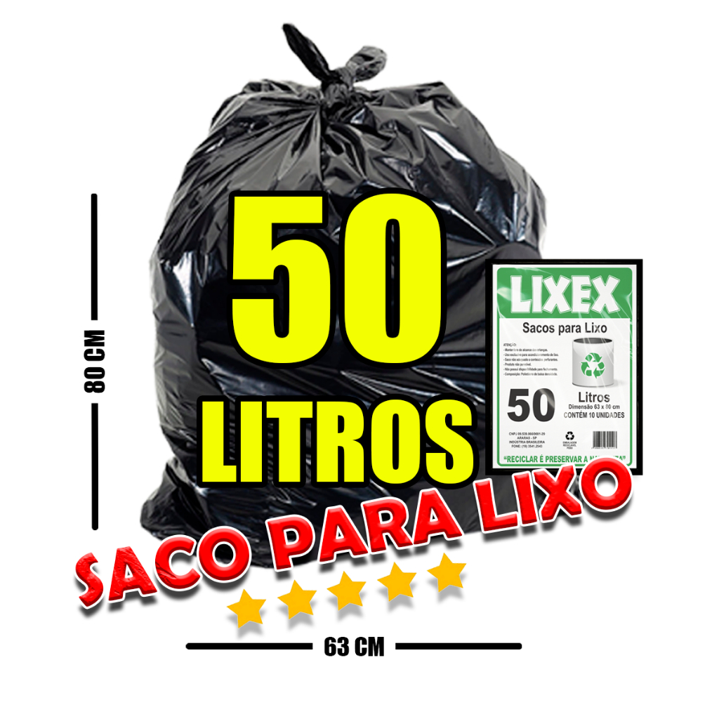 | Saco de Lixo 50 Litros - Lixex - 10 pacotes (100 sacos de 50 litros) este produto | R$ 49,90 | 38% | 4.9/5 | 5 |