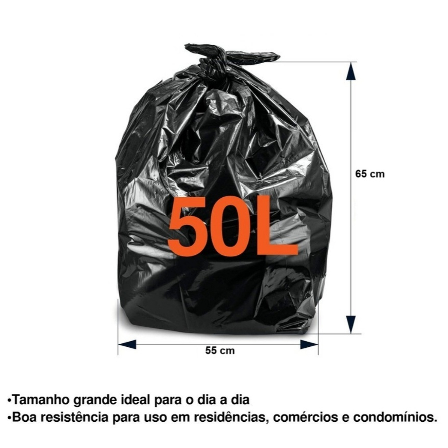 O saco de lixo é uma opção sustentável e consciente para o descarte adequado de resíduos. Fabricado a partir de materiais reciclados, sua produção é menos prejudicial ao meio ambiente em comparação com sacos de lixo tradicionais. Este produto é adequado para uso em diversas situações, como em residências, condomínios, hotéis, pousadas, empresas, restaurantes e comércios em geral. O saco de lixo possui resistência adequada, evitando que se rasgue ou rompa durante o transporte ou descarte de resíduos. Com cor preta discreta, adapta-se a diferentes ambientes e situações. Ao escolher este produto, contribui-se para a preservação do meio ambiente e para um futuro mais limpo e saudável. - Pacote com 100 sacos de lixo de 50 litros. - 65x55 cm