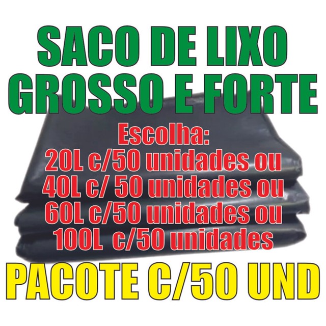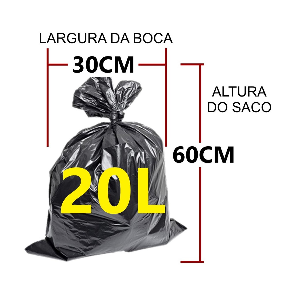 -->> PREZADO CLIENTE, POR GENTILEZA CONFIRA A MEDIDA CORRETA ANTES DE COMPRAR DESCRIÇÃO DO PRODUTO: Cor: Preto Micra (Espessura) do Saco: Composição: Polietileno e pigmento. ----------------- MEDIDAS: ----------------- --> 20 LITROS Comprimento: 30cm Largura(Boca): 60cm --> 40 LITROS Comprimento: 70cm Largura(Boca): 33cm --> 60 LITROS Comprimento: 80cm Largura(Boca): 39cm --> 100 LITROS Comprimento: 90cm Largura(Boca): 46cm Sobre a loja: -->> QUANDO NECESSÁRIO EMBALAMOS EM PLASTICO BOLHA E ENVOLVEMOS COM PAPELÃO PARA GARANTIR A QUALIDADE DO PRODUTO ATÉ A ENTREGA. :: Estamos há mais de 20 anos no mesmo endereço atendendo clientes da nossa região em loja física. :: Entrega com rapidez e garantida. Comprou e não gostou? É só devolver. :: Fazemos postagem todos os dias, nos dias úteis em até no máximo 12 horas após confirmação do pagamento. :: Seu pedido é despachado em até 12h úteis após confirmação de pagamento (De Segunda-feira a Sexta-feira). :: Ficou alguma dúvida? Faça sua pergunta e teremos prazer em responder o mais breve possível. :: Há 20 anos atendendo bem para atender sempre.