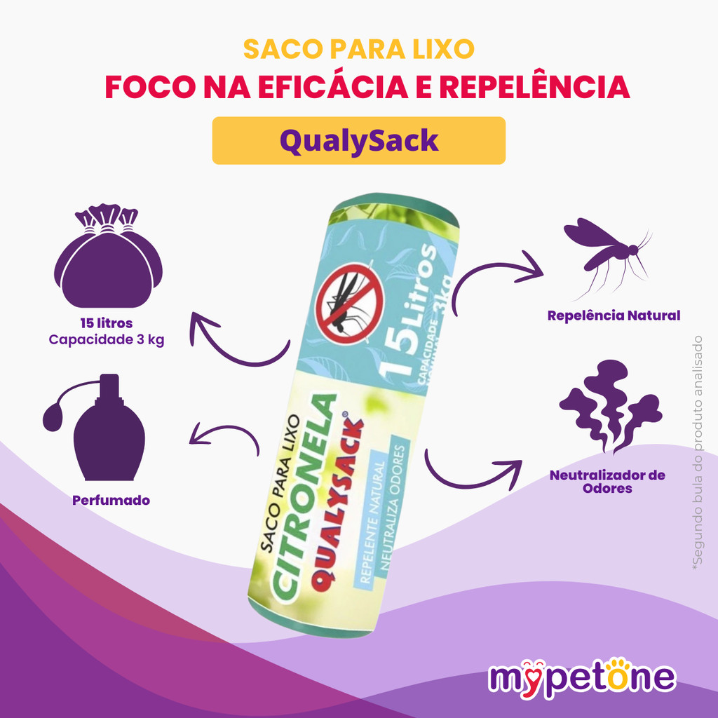 Sacos para Lixo Perfumados Citronela – 15 Litros Descarte seu lixo com mais higiene e conforto usando os Sacos para Lixo Perfumados Citronela da Qualysack. Com fragrância especial de Citronela, esses sacos neutralizam odores desagradáveis, mantendo o ambiente sempre agradável e perfumado. - Perfume antiodor: Aroma suave e duradouro de lavanda que combate e elimina maus cheiros. - Alta resistência: Desenvolvidos para suportar peso, evitando vazamentos e proporcionando total segurança no transporte e descarte dos resíduos. - Eco-friendly: Feitos 100% com material reciclado, contribuindo diretamente para a preservação do meio ambiente. Especificações: - Quantidade: 60 sacos por rolo - Dimensão: 39cm x 58cm - Volume: 15 litros Ideais para uso doméstico ou empresarial, os sacos Qualysack são práticos, resistentes e sustentáveis. Escolha Qualysack – Qualidade em cada detalhe!