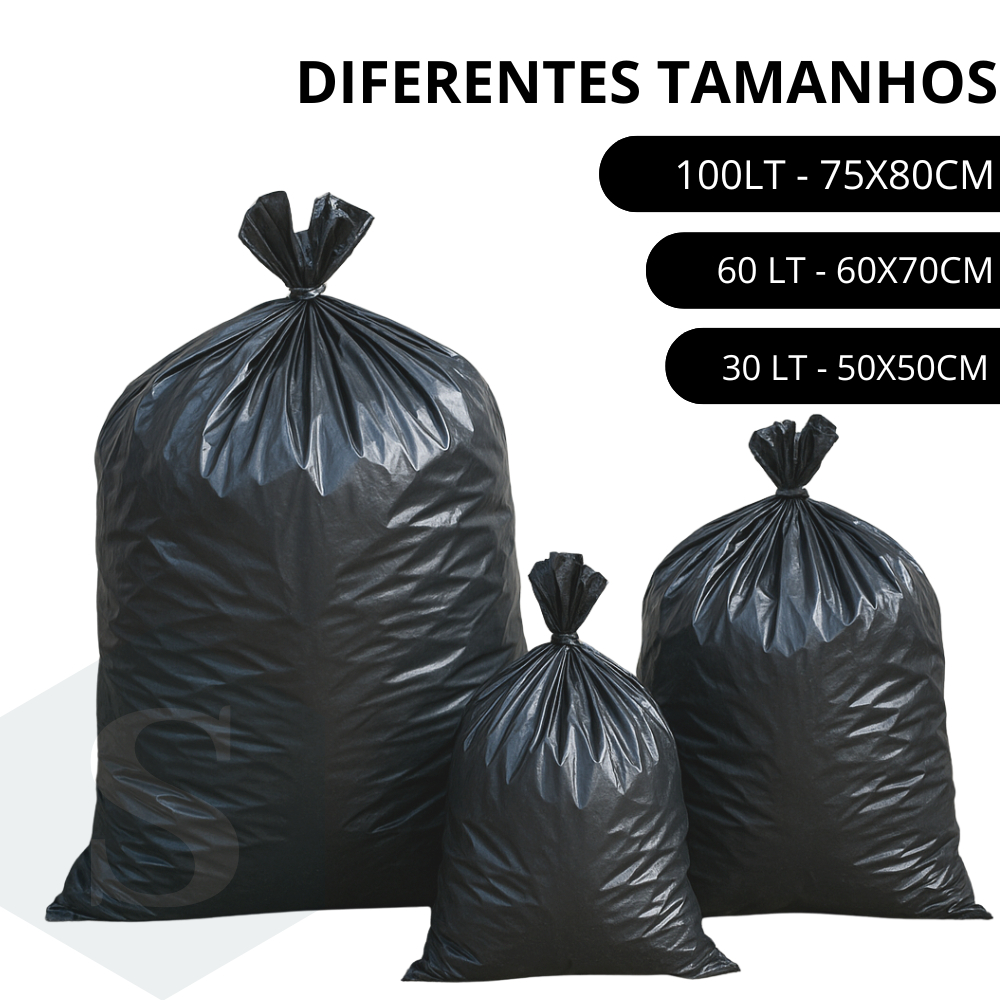 Saco de Lixo Comum Produto com diferentes tamanhos: Medidas Externas: 30LT - 50X50CM 60LT - 70X60 cm 100LT - 80X75 cm Quantidade: 100 Unidades Cor: Preto Composição: Polietileno de baixa densidade e pigmento. Indicação: Uso doméstico, condomínios, hotéis, pousadas, empresas, restaurantes, comércios em geral e etc. Produtos em grande quantidade no estoque ! Postagem imediata em até 24 horas ! Aconselhamos comprar sempre uma medida acima do tamanho da lixeira !