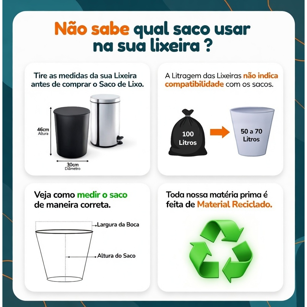 | Saco de lixo 100 Litros pacote com 100 ou 50 unidades 0.6 micras | R$ 21,89 | 51% | 4.7/5 | 2.1 mil |