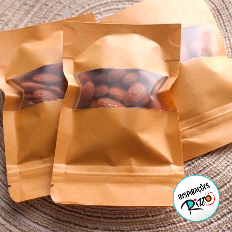 Saco de Papel Kraft com Visor Stand Up Pouch Zip 12x20cm - Hermético Fosco p Fora Impermeável p dentro - 10 un - Rizzo