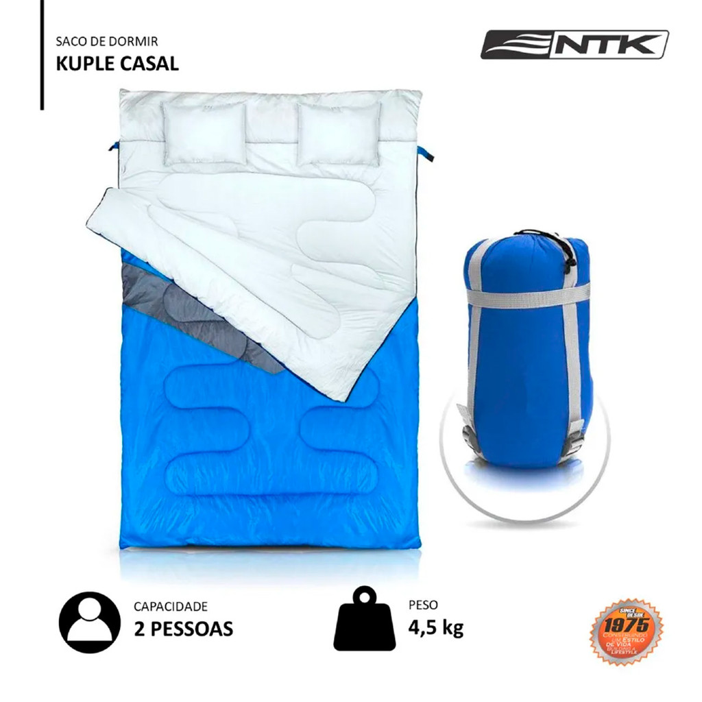 # Auto Equip # Seja bem-vindo(a)!!! --- Descrição: Saco de Dormir Nautika Kuple Casal Faixa de Temperatura de -5°C à 5°C Azul - Nautika Um bom saco de dormir é um equipamento essencial para uma noite de sono confortável no camping. O saco de dormir Kuple da Nautika foi desenvolvido para casais, é um modelo duplo, exclusivo no mercado, já que pode ser transformado em dois sacos de dormir individuais. Acompanha dois travesseiros incorporados e bolsa de transporte com fitas compressoras, facilitando o seu manuseio, transporte e compactação. Suas medidas extra dimensionadas e o capuz incorporado na parte superior proporcionam maior conforto na utilização por parte dos usuários. O produto preza pela qualidade em todos os detalhes: suporta temperaturas que vão de -5°C a 5°C, possui tecido exterior, capaz de repelir líquidos, zíper de alta durabilidade, que aguenta muitas aberturas. Importante o zíper fica localizado no lado direito do saco de dormir. Para ter toda a capacidade do saco de dormir, use em conjunto com isolante térmico. O Kuple pode ser utilizado de forma separada, formando dois sacos de dormir independentes. O produto pesa 4,5 kg, tem medidas de 75 cm (A) x 2,1 m (L) e está disponível na cor azul e branca. Se você está procurando um saco de dormir com alta qualidade e excelente desempenho, conheça o Kuple casal Unica, da Nautika. O raio de temperatura: - 5°C - CONFORTO - -5°C - EXTREMO Informações - Material interior: Algodão com poliéster escovado; - Material exterior: Poliéster 210T; - Enchimento: Hollow-Fiber; - Peso do produto: 4,5kg; - DImensões: 2,1m x 1,5m; - Marca: NTK. Conteúdo da Embalagem - 01 Saco de Dormir Nautika Kuple Casal Faixa de Temperatura de -5°C à 5°C Azul - Nautika Importante - Garantia de 03 meses; - Pedidos aprovados até 12h00 de segunda a sexta será enviada no mesmo dia; - Enviamos em até 24h úteis; - A embalagem pode variar de acordo com o estoque do fabricante; - Imagens meramente ilustrativas; - A cor do produto pode variar de acordo com a tela do seu smartphone ou computador; - Utilize o campo de "Perguntas e respostas" e esclareça suas dúvidas com nosso suporte técnico.
