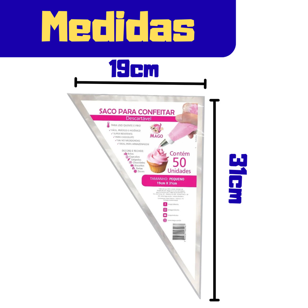 O Kit com 5 Sacos de Confeitar da Mago é o utensílio perfeito para confeiteiros que buscam precisão, controle e agilidade em trabalhos detalhados. Com o tamanho PEQUENO de 19x31cm, estes sacos são ideais para pequenas quantidades de glacê, sendo perfeitos para:Detalhamento Fino: Fazer escritas, rendas e contornos delicados.-Decoração com Múltiplas Cores: Permite que você utilize várias cores ao mesmo tempo, sem desperdício de material.-Aplicação de Recheios em Doces Pequenos: Como macarons e bombons.-Feitos em material resistente, estes sacos de confeitar são descartáveis, garantindo a máxima higiene e eliminando a necessidade de limpeza. Sua resistência é adequada para o uso com ou sem bicos de confeitar, proporcionando controle superior em suas criações.Ficha Técnica:Marca: Mago Produto: Saco de Confeitar (Piping Bag) Material: Plástico Descartável (Geralmente Polietileno) Tamanho da Unidade: 19 cm x 31 cm (Pequeno) Quantidade: 5 Unidades por Pacote Uso Indicado: Detalhes, escritas, contornos, aplicação de pequenas quantidades de cobertura e glacê. Compatibilidade: Uso com bicos pequenos/médios ou sem bico.FAQ – Perguntas Frequentes:O produto é novo? Sim, todos os produtos são novos.Tem pronta entrega? Sim, todos os produtos anunciados estão disponíveis para envio imediato.Posso trocar ou devolver? Sim, aceitamos devolução ou troca conforme as políticas da plataforma.O produto acompanha nota fiscal? Sim, enviamos.Qual a principal vantagem do tamanho PEQUENO (19x31cm)? A principal vantagem é a precisão e o controle que oferece para trabalhos de detalhamento e a economia de material ao trabalhar com muitas cores diferentes.Posso usar este saco com acopladores? Sim, o tamanho pequeno é compatível com acopladores, que permitem a troca rápida de bicos de confeitar mantendo o mesmo saco e a mesma cor de creme.O material do saco é resistente ao rasgo? Sim, por ser um produto da Mago, o plástico é desenvolvido para ser resistente e suportar a pressão necessária para a aplicação precisa de glacê.
