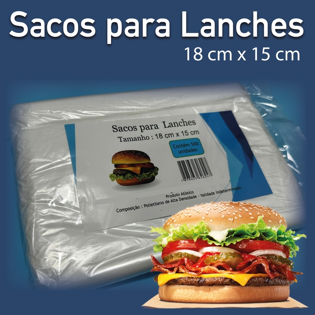 Saco plástico para lanches c/500 unidades ***Produto com variação. O tamanho deve ser selecionado no ato da compra.*** A embalagem plástica perfeita para seus lanches!! Produto atóxico. Composição: polietileno de alta densidade. Quantidade: 500 unidades Imagens ilustrativas.