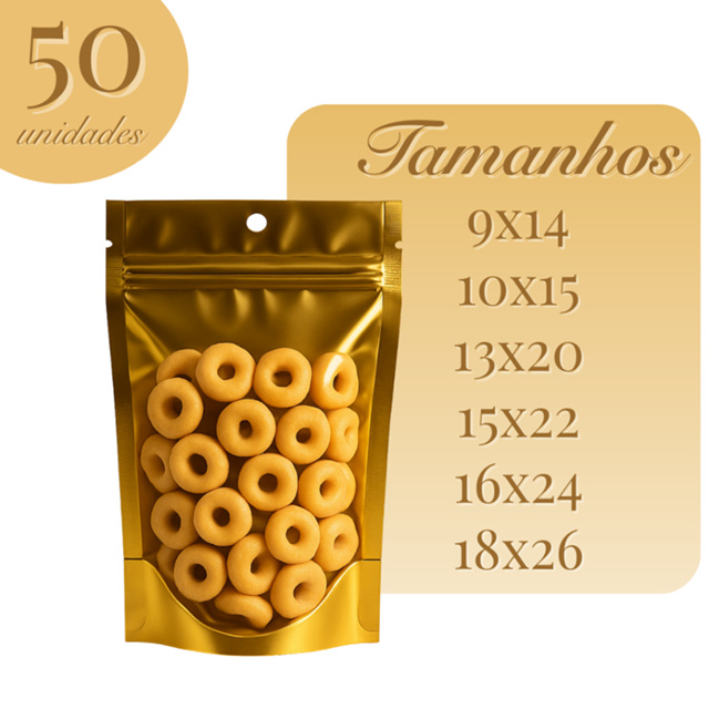 | Saco Stand Up Pouch Dourado Brilhante C/50 Un Laminado Metalizado Z... este produto | R$ 32,18 | — | 5.0/5 | 99 |