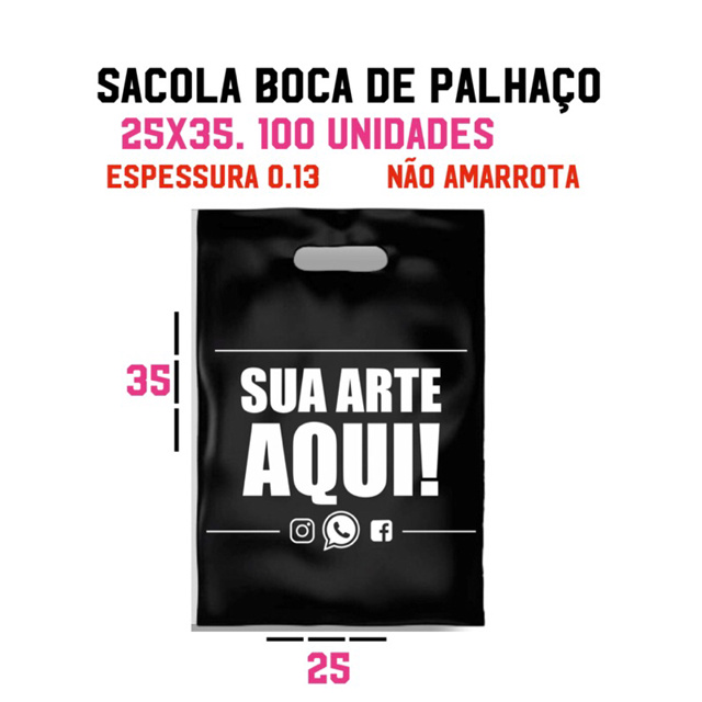 sacola personalizada 25x35.com sua logo. 100 unifdades com apenas uma cor sacola bem grossa espessura 0.13 não amarrota nos mande a logo pelo chat as cores das sacolas são : Preto ,branca,rosa,vermelho,prata ,dourada ,azul e verde cores da logo: branca ,preto,rosa,azul ,prata,dourada,rose,laranja,verde,marrom … o prazo de personalização é de no máximo 20 dias