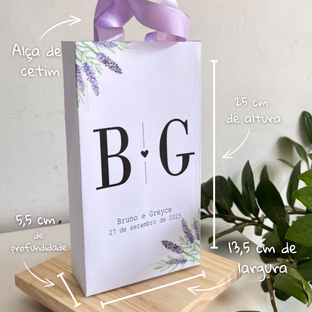 LEIA AQUI: * Para uma MAIOR QUANTIDADE: - Adicionar as quantidades desejadas no carrinho Ex: 8 unidades : 5uni - uma vez + 3uni- uma vez - ( a partir de 15) pedir no chat o link SEMPRE CONFIRA AS MEDIDAS! Tamanho 13,5 Comp X 5,5cm largura L X 25cm Altura *Feita em papel 180g fosco *alça em cetim( a tonalidade da cor e seu tamanho será de acordo com disponibilidade, pode variar) *Enviar no chat dados para arte (opcional): - Arte ou logo (caso já tenha) - nomes convidados - nomes dos noivos - data - texto/frase - Cor da alça *Não enviamos arte para aprovação **Ver disponibilidade de arte de cor diferentes**