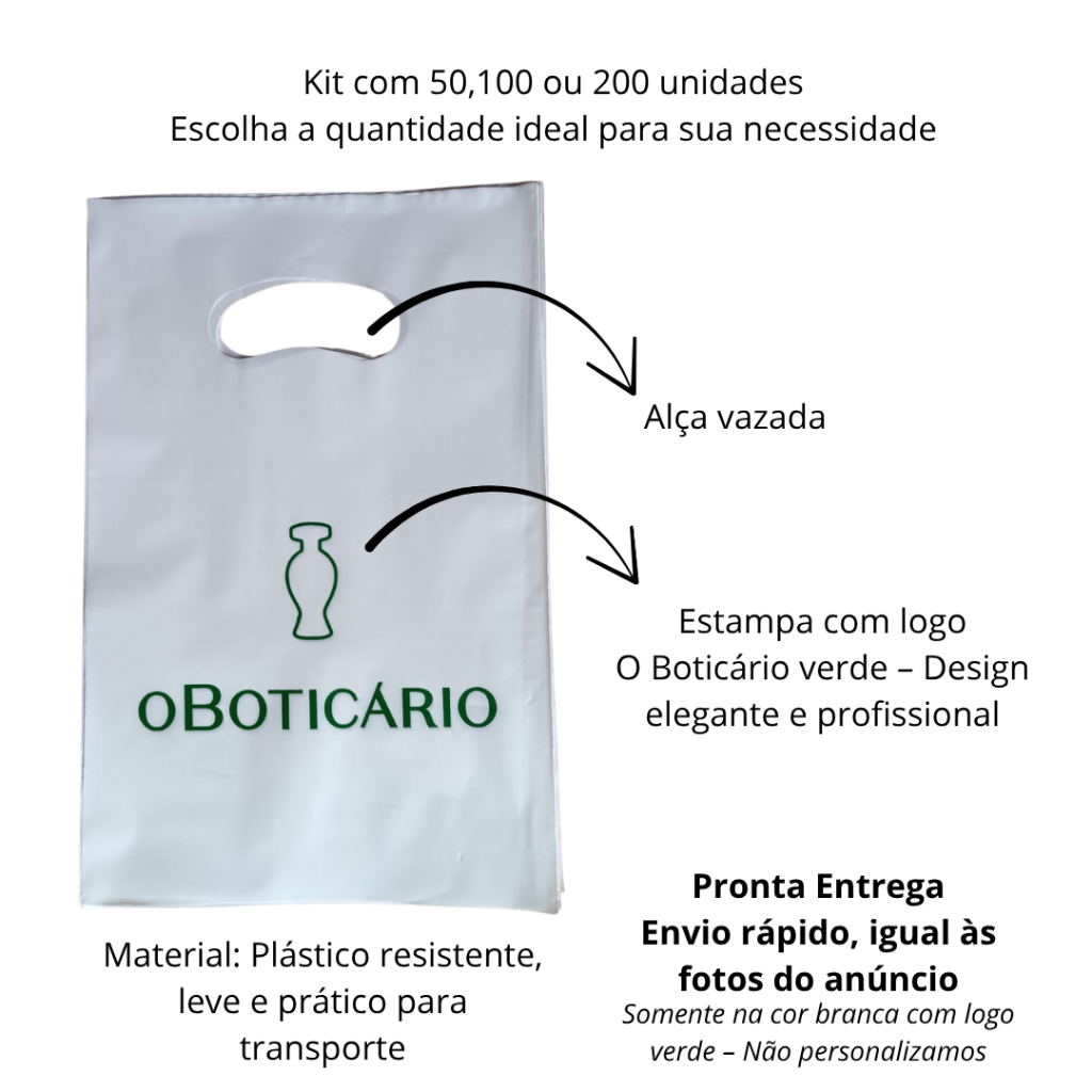 🛍 Kit Sacolas Plásticas O Boticário 20x30 – Pronta Entrega! Transforme suas entregas e presentes com elegância! Kit de sacolas plásticas com logo O Boticário – perfeitas para quem busca praticidade e uma apresentação profissional. 📦 ➢ Detalhes do Produto: ✔ Kit com 50, 100 ou 200 unidades ✔ Tamanho: 20x30cm ✔ Material: Plástico resistente ✔ Cor: Branca ✔ Logo: Verde (conforme imagem do anúncio) ✔ Produto sem personalização – enviado exatamente como nas fotos 🎯 ➢ Indicado para: • Lojas, revendedores e presentes personalizados • Organizar kits de beleza, perfumes e cosméticos • Dar um toque especial na entrega dos seus produtos ⚠️ ➢ Observações Importantes: • PRONTA ENTREGA • NÃO fazemos personalizações • Imagens reais do produto – será enviado conforme a foto do anúncio Qualidade e charme para encantar seus clientes em cada entrega!