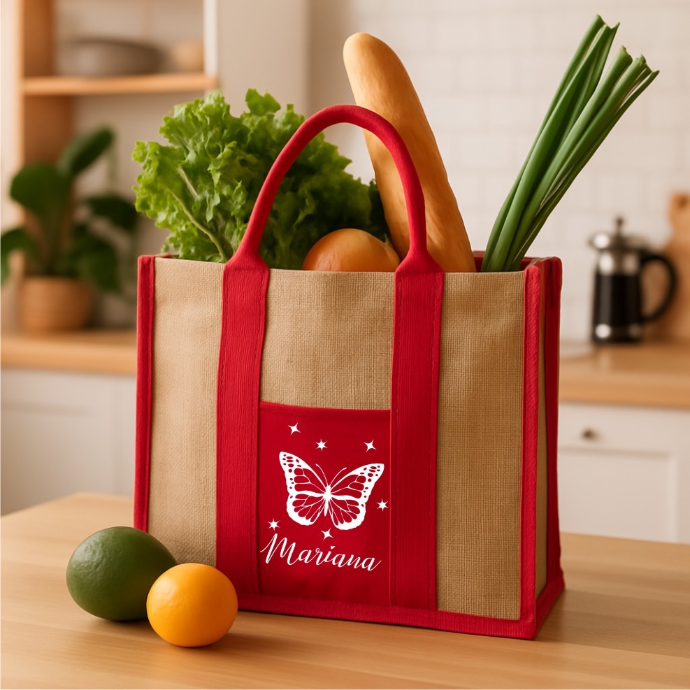 Sacola Ecológica de juta com bolso de Linho Personalizada com Nome Sustentável e Resistente Várias Estampas