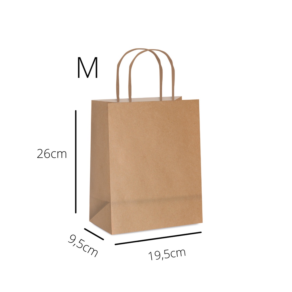10 Unidades Sacola de Papel Kraft. Tamanho P: 21,5 x 15 x 8 Tamanho M: 26 x 19,5 x 9,5 Tamanho G: 32 x 26,5 x 13 Tamanho GG: 39 x 32 x 16 Obs: Sacola tamanho G e GG acompanha um papel cartão para reforço no fundo do produto.