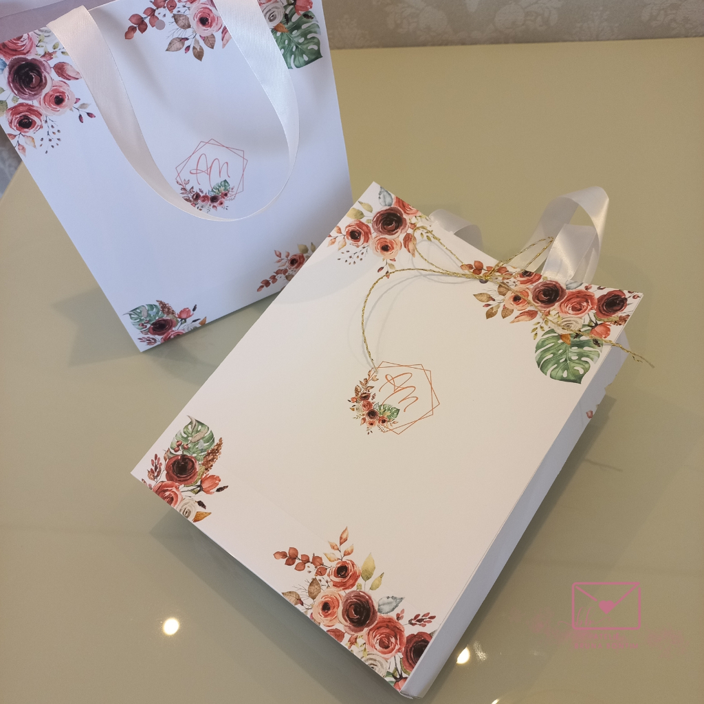 Sacola confecção em papel offset gramatura 180. Dimensões: 25x20x7cm Incluso alças de cetim ******** ATENÇÃO ******** - Escolher o floral na variação que deseja antes de finalizar o pedido. Após efetuar o pagamento, favor entrar em contato via chat para nos passar a informação necessária, como: - Nomes dos Noivos. _________________________________________________________________ **** TROCAS, DEVOLUÇÕES E REEMBOLSO **** Não aceitamos trocas, devoluções ou reembolso em nossa loja por se tratar de itens personalizados e feitos sob encomenda.