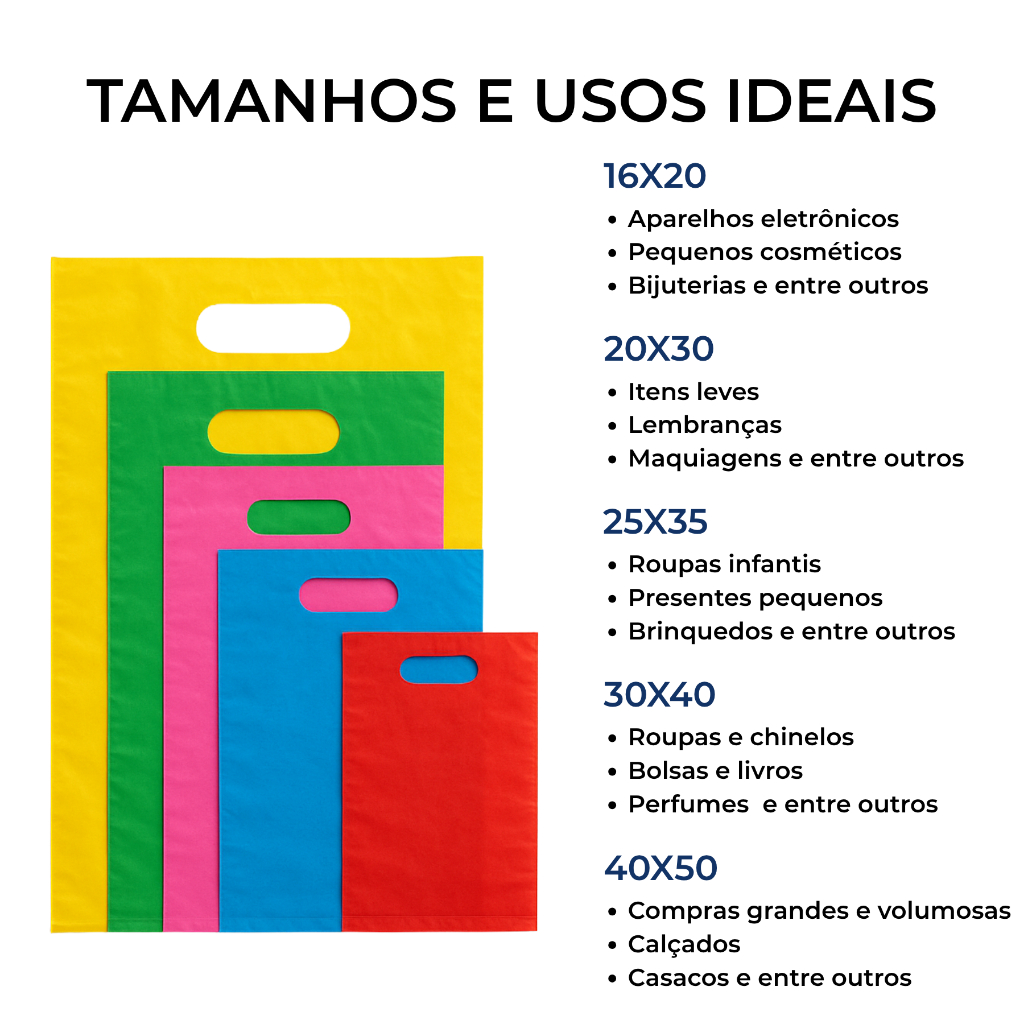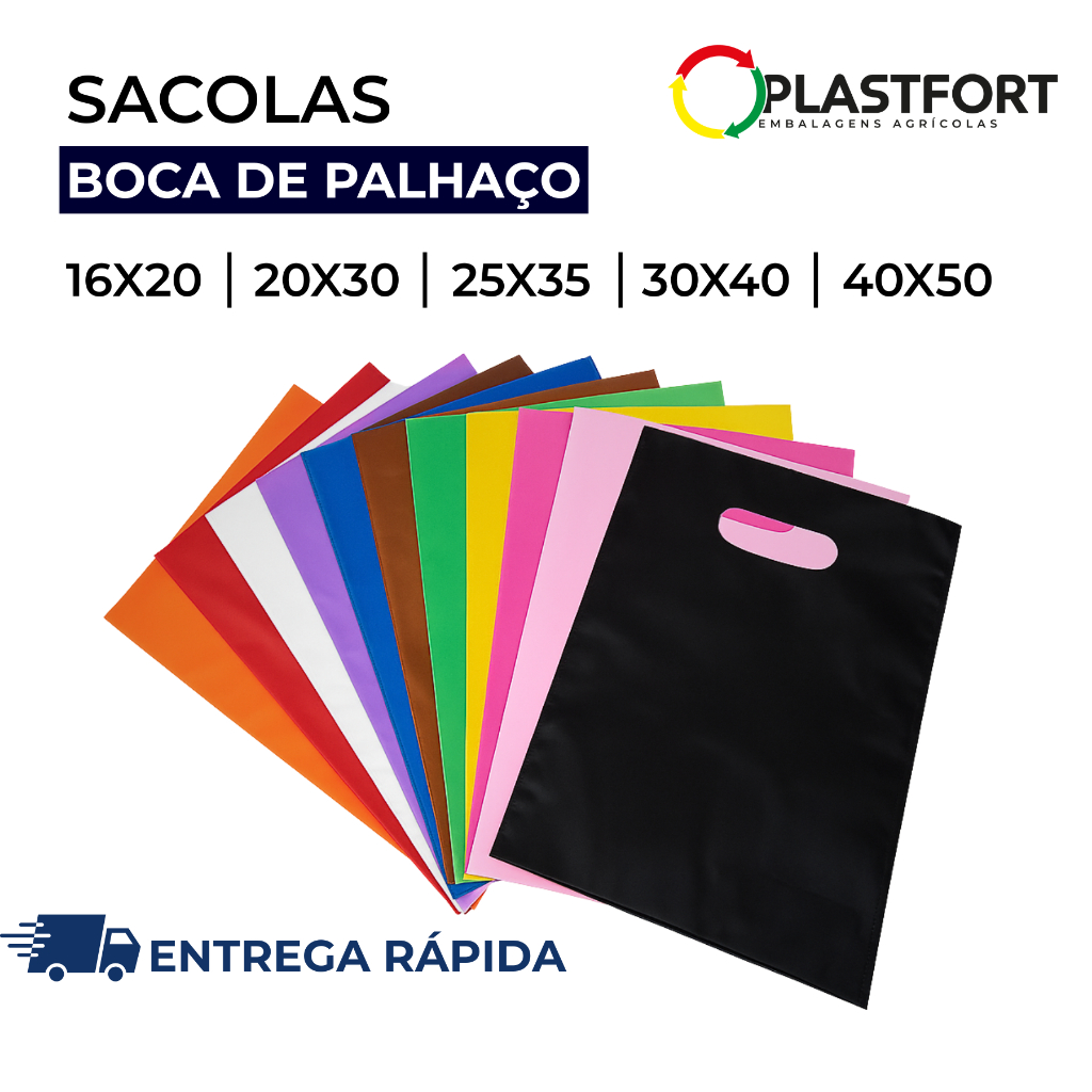 🛍️ 100 Sacolas Plásticas com Alça – Tipo Boca de Palhaço | Material Virgem 0,11mm ✨ Alta resistência | Cores vivas | Diversos tamanhos disponíveis ✨ 📦 O que você vai receber: ✅ 1 Fardo com 100 unidades 🎨 Cores disponíveis: Branco | Preto | Transparente | Rosa | Azul | Verde | Vermelho | Amarelo | 📏 Tamanhos disponíveis: 16x20 cm – Bijuterias e pequenos cosméticos 20x30 cm – Itens leves e lembranças 25x35 cm – Roupas infantis e presentes pequenos 30x40 cm – Roupas e brindes médios 40x50 cm – Compras grandes e volumosas 💎 Destaques do Produto: 📢 Material Virgem Premium (0,11 mm) – Muito mais espessa, firme e resistente que as comuns do mercado. 📢 Acabamento Profissional – Aparência bonita e toque de qualidade. 📢 Alça tipo Boca de Palhaço – Confortável, moderna e prática. 📢 Cores Vivas e Modernas – Valorize sua marca e impressione seus clientes. 📢 Resistência Superior – Ideal para uso em lojas, feiras e comércios que exigem qualidade. 💬 Dúvidas Frequentes: 🟢 As sacolas são realmente resistentes? ➡️ Sim! São fabricadas com plástico virgem de alta qualidade e 0,11 mm de espessura. 🟢 Quantas unidades vêm no pacote? ➡️ Cada kit contém 100 sacolas embaladas e conferidas com cuidado. 🟢 Posso escolher as cores? ➡️ Sim! Escolha a cor desejada 🟢 Serve para presentes ou brindes? ➡️ Perfeito! Deixa qualquer entrega mais bonita e profissional. 🚚 Pronta entrega para todo o Brasil 🏭 Fabricação própria, direto da Plastfortsul Embalagens 🤝 Atendimento humanizado e suporte rápido Destaque sua marca e encante seus clientes com as sacolas plásticas tipo boca de palhaço Plastfortsul, feitas com matéria-prima 100% virgem e espessura de 0,11 mm — a mais grossa e resistente do mercado. Ideais para lojas, presentes, roupas, cosméticos, brindes e acessórios, oferecendo beleza, durabilidade e excelente custo-benefício.
