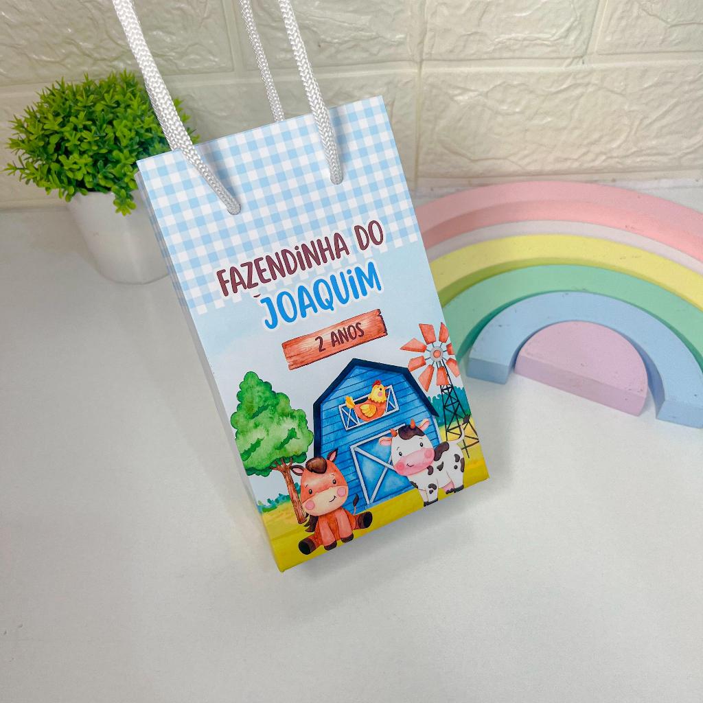🎉 Sacolinha Personalizada – Tema Fazendinha azul 🔹 Versão Pegue e Monte (enviada desmontada) 💡 Como funciona: Você recebe as sacolinhas já recortadas e com vincos, prontas para montar em casa. Acompanha QR Code com vídeo explicativo para facilitar. 👉 Use cola líquida, cola escolar ou cola quente para a colagem. ⚠️ Importante: confira o prazo de entrega para garantir que chegue antes da festa. ✨ Detalhes do produto: Produzido em papel fotográfico brilho 180g (resistente e com impressão de alta qualidade) Personalização com nome e idade do aniversariante Fundo de encaixe prático + alcinhas inclusas 📏 Medidas da sacolinha P: Altura: 16 cm | Largura: 10 cm | Lateral: 3,5 cm 📌 O que você recebe: ✅ Sacolinhas desmontadas – Pegue e Monte ✅ Alças separadas ✅ Fundo com encaixe fácil ✅ QR Code com vídeo de montagem ➡️ Após a compra, envie no chat o nome e idade do aniversariante. ❌ Caso não envie em até 48h, o produto será enviado apenas com a arte do tema (sem personalização).