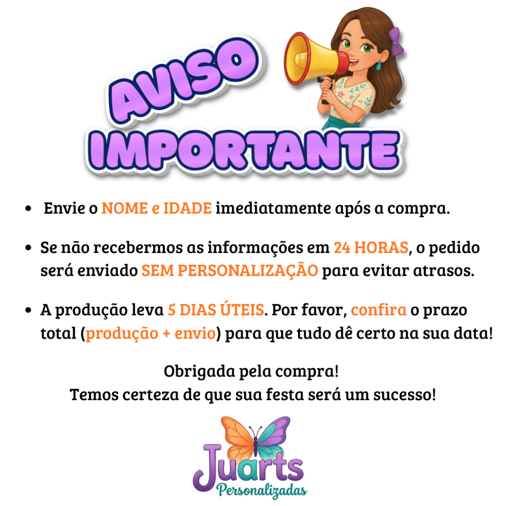 Sacolinha Personalizada - PEGUE E MONTE ✅ Enviamos cortada e vincada – só precisa dobrar e colar! (Não acompanha Cola) ✅ Personalizada com nome e idade do aniversariante. (Mandar via Chat) ✅ Alças na cor Branca. ✅ Papel Offset 180g – acabamento fosco (sem brilho). 📏 MEDIDAS DA SACOLINHA Dimensões Montada: Largura: 20 cm | Altura: 15 cm | Profundidade/Lateral: 6,7 cm. ⚠️ ATENÇÃO! LEIA ANTES DE COMPRAR PEGUE E MONTE - a sacolinha é enviada desmontada, com corte e vinco eletrônico para facilitar na montagem. NÃO ACOMPANHA COLA. (Recomendamos cola branca, cola de silicone ou fita dupla face para a colagem). Verifique o prazo de entrega total (produção + frete) para garantir que o pedido chegue a tempo do seu evento. ✏️ PERSONALIZAÇÃO E PRAZO Prazo: 5 dias úteis para postagem. Regra de Arte: Não é possível alterar a arte do tema . Inserimos apenas o nome e idade. URGENTE: Caso os dados (nome e idade) não sejam enviados em até 24h após a compra através do chat, o pedido será enviado SEM PERSONALIZAÇÃO (apenas com o tema). 💬 DÚVIDAS? Entre em contato pelo chat! Estamos à disposição para te ajudar!