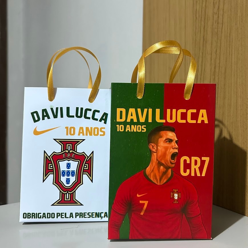Sacolinha surpresa personalizada CR7 Seleção Portugal Timepara festa infantil, perfeita como lembrancinha de aniversário. Fazemos todos os temas: Casamento, Consultorios Odontologicos, Clinicas de estetica, Maquiagem, heróis, princesas, times de futebol e muito mais. As sacolinhas são entregues rapidamente, com qualidade de impressão e acabamento profissional, garantindo que cada detalhe faça a diferença na festa e encante os convidados. Como funciona: - Após a compra, envie no chat o nome e a idade da criança. - Você recebe opções de arte para escolher a sua favorita. - Produção e despacho em 3 a 7 dias úteis. Características do produto: - Papel fotográfico brilhante e resistente; - Impressão em alta definição; - Acabamento limpo e preciso; - Tamanho 17,5 (Altura) x10 (Largura) x4 (Comprimento) - Vai montado com fundo para finalizar (Simples e rápido) Precisa de uma Sacolinha Maior? Temos três opções grandes disponiveis com as seguintes medidas: 25x15x5 e 15x22x7 e 21x14x6 (Solicite o link pelo chat) Precisa receber com urgência? Entre em contato via chat para negociar envio expresso. Atendemos festas em todo o Brasil com milhares de sacolas produzidas desde 2015. Sim! Basta informar as medidas para verificarmos a disponibilidade. - Qual o prazo de entrega? Prazo médio de entrega entre 2 e 8 dias após despacho, garantindo que sua festa seja atendida a tempo - Minha festa é em data próxima, e agora? Em casos de festa próxima, entre em contato via chat para verificarmos envio urgente.