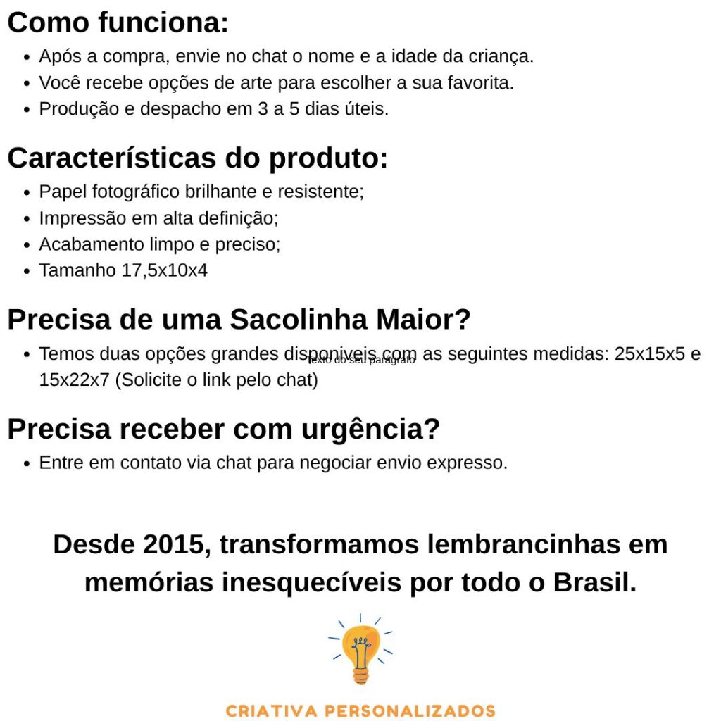 Sacolinha surpresa personalizada Tinker bell para festa infantil, perfeita como lembrancinha de aniversário. Fazemos todos os temas: Casamento, Consultorios Odontologicos, Clinicas de estetica, Maquiagem, heróis, princesas, times de futebol e muito mais. As sacolinhas são entregues rapidamente, com qualidade de impressão e acabamento profissional, garantindo que cada detalhe faça a diferença na festa e encante os convidados. Como funciona: - Após a compra, envie no chat o nome e a idade da criança. - Você recebe opções de arte para escolher a sua favorita. - Produção e despacho em 3 a 7 dias úteis. Características do produto: - Papel fotográfico brilhante e resistente; - Impressão em alta definição; - Acabamento limpo e preciso; - Tamanho 17,5 (Altura) x10 (Largura) x4 (Comprimento) - Vai montado com fundo para finalizar (Simples e rápido) Precisa de uma Sacolinha Maior? Temos três opções grandes disponiveis com as seguintes medidas: 25x15x5 e 15x22x7 e 21x14x6 (Solicite o link pelo chat) Precisa receber com urgência? Entre em contato via chat para negociar envio expresso. Atendemos festas em todo o Brasil com milhares de sacolas produzidas desde 2015. Sim! Basta informar as medidas para verificarmos a disponibilidade. - Qual o prazo de entrega? Prazo médio de entrega entre 2 e 8 dias após despacho, garantindo que sua festa seja atendida a tempo - Minha festa é em data próxima, e agora? Em casos de festa próxima, entre em contato via chat para verificarmos envio urgente.