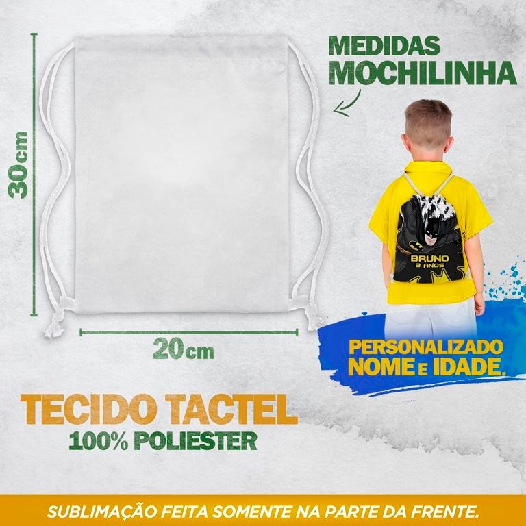 ****LEIA O ANÚNCIOS ANTES DE EFETUAR SUA COMPRA**** Sacola Mochila Personalizada com NOME e IDADE Descrição: O kit contém a quantidade de unidades selecionadas. MATERIAL: Tecido 100% Poliester A estampa é feita pelo método de Sublimação, fazendo com que ela fique com cores bem fortes, alta durabilidade e uma imagem de alta resolução. * Estampa somente na parte da frente, parte de trás branco. *A cor pode variar em até 20% devido a configuração de cada monitor ou celular. MEDIDAS: 20 largura x 30 altura CM Podendo variar de 1 cm para mais ou para menos por causa da costura - Alças já incluso na Mochila, cor branco. *PODE MESCLAR OS MODELOS ? PODE SIM APÓS A COMPRA INFORME QUAIS DESEJA E QUANTIDADE. FABRICAÇÃO O prazo de confecção é de até 7 dias corridos ENTREGA A entrega pode ser feita por pac verifique sempre antes seu prazo e consulte , -ASSIM QUE EFETUAR A COMPRA, NO CHAT ENCAMINHE O NOME DO ANIVERSARIANTE E IDADE !! (por exemplo: "Gael, 2 anos"). Obs.: Não será apresentada amostra para aprovação. A estampa será a mesma da imagem deste produto. QUAQUER DÚVIDA ESTAMOS A DISPOSIÇÃO NO CHAT. 17/07/2023 10:14:54