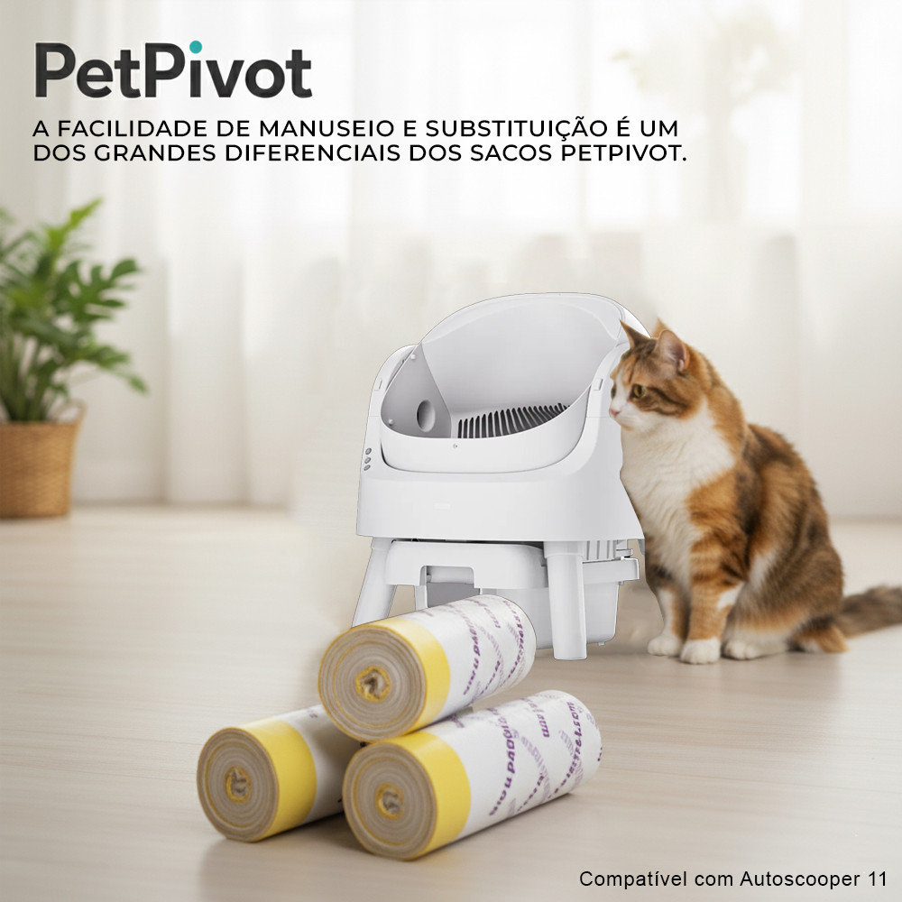 PetPivot Sacos Autolimpantes para Caixa de Areia, Pacote com 60 Unidades (3 Rolos), Sacos Resistentes, Duráveis, Com Cordão, Sem Odores, Substituição Rápida e Prática Caixa de Areia Automática 1. O PetPivot é o pacote ideal de 60 sacos autolimpantes, projetados especialmente para a caixa de areia automática Autoscooper 11. Cada pacote contém 3 rolos com 20 sacos cada, proporcionando o suprimento perfeito para garantir a higiene contínua e eficiente da caixa de areia. Praticidade e eficiência no processo de limpeza. 2. Fabricados com material extra grosso, os sacos PetPivot são altamente resistentes a furos e rasgos, evitando vazamentos e oferecendo maior durabilidade. Isso garante que os sacos se mantenham íntegros durante o uso, mesmo com a areia pesada ou a movimentação do gato, facilitando o processo de descarte sem preocupações com rupturas. 3. A facilidade de manuseio e substituição é um dos grandes diferenciais dos sacos PetPivot. Com cordões duplos para fechamento, você pode trocar os sacos rapidamente, sem esforço. Basta puxar os cordões e o saco está pronto para ser descartado, economizando tempo e tornando a manutenção mais ágil. 4. Os sacos PetPivot foram projetados para manter o ambiente livre de odores desagradáveis e evitar o vazamento de areia. Seu material especialmente desenvolvido cria uma barreira eficaz contra a dispersão de cheiros, mantendo sua casa com um cheiro fresco por mais tempo e evitando sujeira nos arredores da caixa de areia. 5. Tenha um suprimento suficiente para uso prolongado. A quantidade de sacos, aliada à facilidade de substituição e ao material durável, simplifica a limpeza da caixa de areia, tornando o processo mais eficiente e sem complicação. Ideal para manter a higiene dos pets com menos esforço e mais conforto. Garantia 90 dias