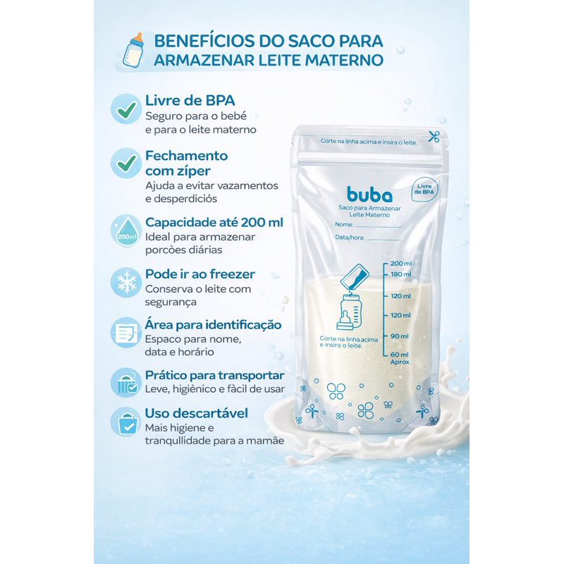 🍼 KIT SACO PARA ARMAZENAR LEITE MATERNO – BUBA Mais praticidade, organização e segurança para a rotina da amamentação. Escolha o kit ideal para o seu dia a dia e armazene o leite materno com total confiança. ⸻ ✨ BENEFÍCIOS DO PRODUTO ✔️ Livre de BPA – seguro para o bebê ✔️ Fechamento com zíper – ajuda a evitar vazamentos ✔️ Pode ir ao freezer e geladeira ✔️ Capacidade até 200 ml por saco ✔️ Área para identificação (nome, data e horário) ✔️ Higiênico e prático para transportar ✔️ Produto descartável ⸻ 📦 OPÇÕES DE KIT (ESCOLHA NA VARIAÇÃO) • Kit com 25 sacos • Kit com 50 sacos • Kit com 100 sacos 👉 Ideal para mães que fazem extração frequente ou desejam montar estoque de leite materno. ⸻ 📏 ESPECIFICAÇÕES • Marca: Buba • Capacidade por unidade: até 200 ml • Material: plástico resistente • Livre de BPA: Sim • Uso: armazenamento e transporte de leite materno ⸻ 📝 COMO USAR 1️⃣ Corte na linha indicada 2️⃣ Insira o leite materno 3️⃣ Feche bem o zíper 4️⃣ Identifique com nome, data e horário 5️⃣ Armazene na geladeira ou freezer ⸻ ❓ PERGUNTAS FREQUENTES Pode ir ao freezer? Sim, o produto é próprio para armazenamento no freezer. É reutilizável? Não. Produto descartável para garantir maior higiene. Vaza? Possui fechamento com zíper que ajuda a evitar vazamentos quando bem fechado. É seguro para o bebê? Sim. Produto livre de BPA, próprio para leite materno. ⸻ 💙 IDEAL PARA: • Mães em fase de amamentação • Retorno ao trabalho • Organização do estoque de leite • Uso diário ou emergencial 📌 Produto original | Envio rápido | Compra segura Shopee