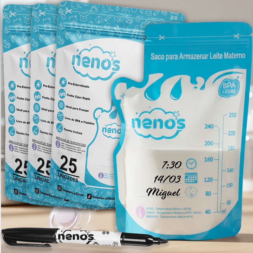 🍼 Sacos para Armazenar Leite Materno – Marca NENOS com Caneta Permanente ✍️ 💖 Segurança, Praticidade e Controle para Cada Gota de Amor! 📦 O que acompanha o KIT: ✅ 25 Sacos para armazenar leite materno (capacidade até 250ml) ✅ 1 Caneta permanente preta para identificação 📌 Opções disponíveis: • ✅ 1 KIT – Total 25 sacos + 1 caneta permanente • ✅ 2 KITs – Total 50 sacos + 2 canetas permanentes • ✅ 3 KITs – Total 75 sacos + 3 canetas permanentes • ✅ 4 KITs – Total 100 sacos + 4 canetas permanentes 🛡️ Características do Produto: 🍼 Capacidade de até 250ml com medidor em mililitros 🚫 Livre de BPA e Ftalatos – 100% atóxico 🌡️ Indicador de temperatura – Auxilia na hora de servir 🔒 Zíper duplo – Mais segurança no fechamento 🗒️ Campo para anotações: Data, hora e nome do bebê ✍️ Caneta permanente incluída – para registrar as informações diretamente no saco 🧼 Uso prático: 1. Rasgue a parte superior pontilhada 2. Abra o zíper duplo 3. Despeje o leite materno 4. Feche o zíper e preencha os dados 5. Para uso, rasgue pelo Bico Abre Fácil ⚠️ Cuidados e Recomendações: 🚫 Não ferver 🚫 Não levar ao micro-ondas 🌬️ Armazenar em local seco e longe do calor 🔍 Verificar o estado da embalagem regularmente – descarte em caso de desgaste 🧸 Não é brinquedo! Mantenha fora do alcance de crianças ♻️ Uso único. Descarte após o uso em local apropriado 📦 Guarde a embalagem para futuras consultas