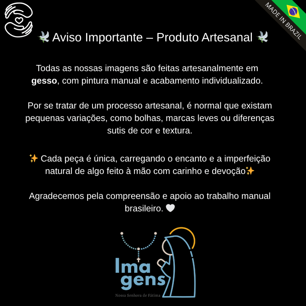 ✨ IMAGEM DE GESSO SAGRADA FAMÍLIA 18 CM – PREMIUM ✨ Linda peça feita à mão com acabamento branco perolado e detalhes dourados, perfeita para decorar e abençoar seu lar 🙏 ⸻ 🕊️ DETALHES DO PRODUTO • Material: gesso de alta qualidade • Altura: 18 cm • Acabamento: pintura perolada com dourado premium • Proteção: camada de verniz para brilho e durabilidade • Produção: artesanal, feita com carinho e fé ⸻ 💖 POR QUE ESCOLHER A IMAGENS NS FÁTIMA • Peças feitas com amor e devoção • Embalagem segura (protegida contra danos no transporte) • Envio rápido 🚚 • Garantia contra quebra • Atendimento atencioso e personalizado 💬 ⸻ 🎁 IDEAL PARA • Presentear pessoas queridas • Decorar seu altar, capela ou cantinho da oração • Demonstrar fé e devoção em casa ⸻ 📦 ENVIO E GARANTIA • Envio em até 2 dias úteis • Embalada com proteção reforçada • Garantia total: se chegar quebrada, substituímos sem custo 💪 ⸻ 🙏 CUIDADOS • Não molhar • Limpar com pano seco e macio ⸻ ✨ Uma peça que traz paz, beleza e fé ao seu lar! ✨ 💒 Imagens NS Fátima – feitas com devoção para abençoar o seu ambiente.
