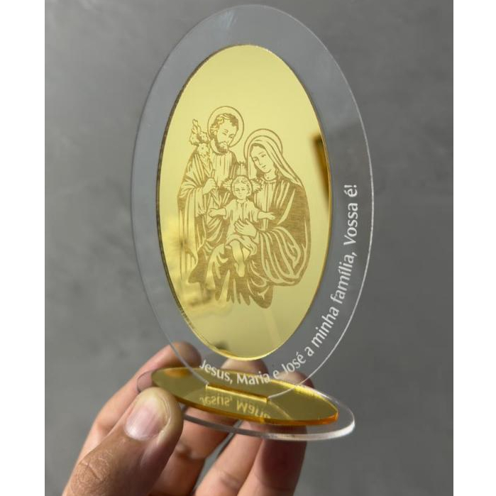 Encante seu ambiente com este lindo enfeite de mesa da Sagrada Família, produzido em acrílico cristal de alta qualidade com detalhes em acrílico espelhado dourado, trazendo fé e delicadeza em cada detalhe. Ideal para decorar mesa de oração, aparador, estante ou altar, é também uma excelente opção de presente religioso, transmitindo proteção, amor e bênçãos para o lar. ✨ Destaques do produto: * Acrílico cristal com acabamento impecável * Detalhes em acrílico espelhado dourado * Design elegante e moderno * Imagem delicada da Sagrada Família * Perfeito para decoração ou presente MEDIDAS: 9CM LARGURA X 13CM ALTURA.