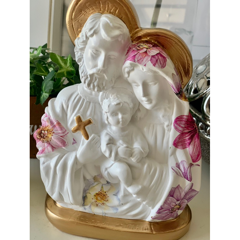 Importados da Holanda, nossos guardanapos são estampados cuidadosamente nas peças.Nossas imagens são únicas e exclusivas, feitas com todo cuidado e amor. O nosso objetivo é atender com excelência e tocar as pessoas como nunca através dos nossos produtos, levando fé e esperança. Imagem Sagrada Família com 20 cm de altura perfeita para presentear ou se presentear! Especificações: Pintura do manto: decoupage flores lilás Detalhes: dourado Acabamento: verniz Material: gesso Dimensões: 20 cm (altura), 16 cm (comprimento) e 6 cm (largura). Conservação da peça: Não utilizar produtos químicos e evitar deixá-la exposta ao sol para maior durabilidade. Limpar apenas com pano seco para retirar o pó. Envio: Produto a PRONTA ENTREGA Postagem em no máximo 24 horas após confirmação de pagamento. Produto será embalado com plástico bolha e jornal para que chegue em segurança. O FRETE será calculado automaticamente no ato da compra. NÃO EMBALAMOS PARA PRESENTE! Para maiores quantidades e dúvidas, consulte-nos pelo campo de perguntas. Será um prazer! Fique com as bençãos de Deus e a proteção de Nossa Mãe Maria. Ótimas compras!!