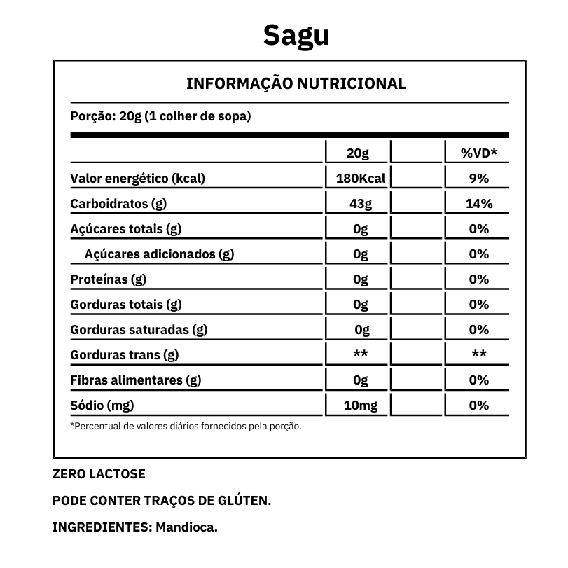 O sagu normalmente é feito a partir da farinha muito fina da mandioca, que se chama fécula, tornando-se um tipo de tapioca em grãos. O sagu é um alimento saudável e que fornece nutrientes importantes ao organismo. Embora carregue grande quantidade de calorias, ele é um carboidrato complexo e apresenta em sua composição fibras, proteínas e sais minerais, como cálcio e ferro. Ingredientes: Mandioca. ALÉRGICOS: PODE CONTER TRAÇOS DE GLÚTEN, LEITE, SOJA, AMENDOIM E CACAU POR CONTAMINAÇÃO CRUZADA. INFORMAÇÕES ADICIONAIS - PODE HAVER VARIAÇÃO DE COR DEPENDENDO DO LOTE. - EMBALAGEM MERAMENTE ILUSTRATIVA.