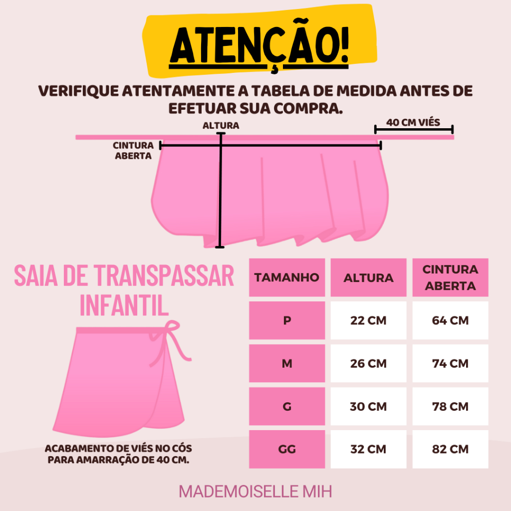 Saia de Transpassar Ballet: Elegância em cada Passo para Pequenas Bailarinas.🩰 Confeccionada em Tecido Helanca Light 100% Poliéster , leve e suave para conforto e o encanto nas primeiras experiências de dança! ------------------------------------------------------------ Disponível em uma paleta de cores delicadas e encantadoras: Branco, Rosa , Preto, Lilás. ------------------------------------------------------------ A Saia de Bailarina de Transpassar é projetada para crescer com sua bailarina em formação, proporcionando estilo e conforto em todas as fases, com acabamento em viés de 40cm para amarração , você pode regular a cintura e deixar no tamanho ideal para sua princesa! ------------------------------------------------------------ CONSULTE A TABELA DE MEDIDA SAIA TRANSPASSAR Medidas em cm (a = Altura) (Cintura Aberta – toda a extensão da cintura na saia) Tam. PP - 20 alt - 56 (cintura aberta) Tam. P - 21 alt - 64 (cintura aberta) Tam. M - 25 alt - 72 (cintura aberta) Tam. G - 30 alt - 77 (cintura aberta) Tam. GG - 32 alt - 79 (cintura aberta) Pode acorrer variação nas medidas de 1,0 até 1,5 cm * As medidas podem ter uma variação de 1,0 a 1,5 cm ------------------------------------------------------------ Perfeita para todas as idade veja também os modelo adulto. ------------------------------------------------------------ Estamos a disposição para esclarecer suas dúvidas, click no chat no canto inferior esquerdo da tela > Conversar Agora Ficaremos muito felizes em poder te ajudar. Mademoiselle Mih Agradece ☺️