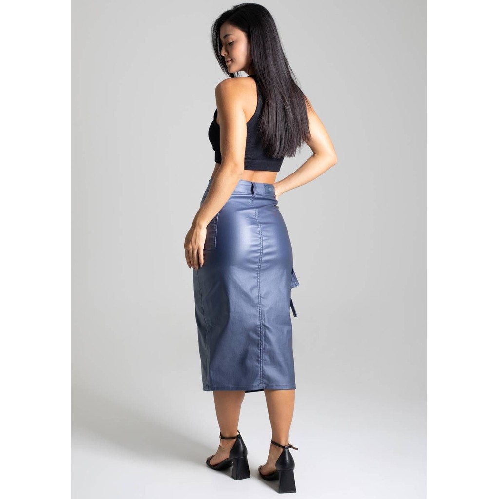 Saia confeccionada em bengaline. O comprimento é longo e o caimento é solto, bolsos laterais cargo. Cintura média Fechamento com ziper lateral Detalhe com fenda frontal Barra simples Modelagem: Longa Tipo de lavagem: color Cor: Azul Composição: 76% Algodão 21% Poliéster 3% Elastano