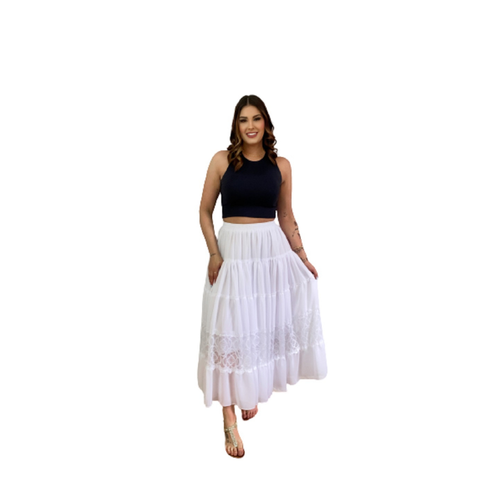 Saia Boho longa estilo Umbanda Branca em Chiffon modelo de Luxo hippie chic