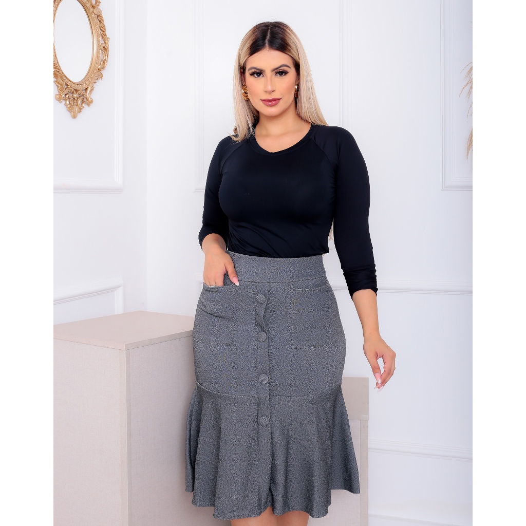 Saia Crepe de Babado Premium 4 Botões com Bolso Moda Evangélica