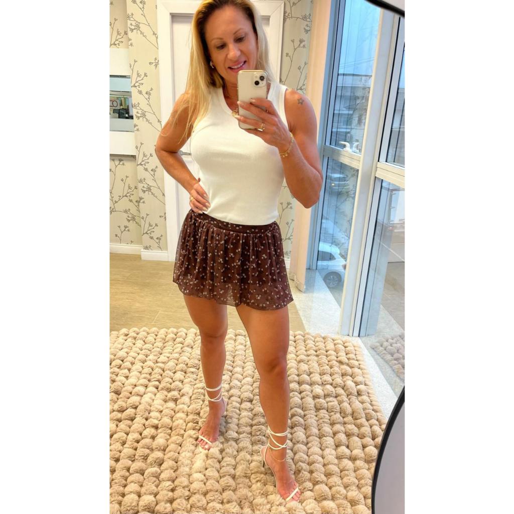 Descrição da Peça Saia balonê de tule com estampa delicada, perfeita para criar looks femininos e modernos. Possui caimento leve, efeito volumoso sutil e forro interno que garante conforto e segurança ao vestir. Ideal para composições casuais ou produções mais elaboradas. Descrição Técnica • Modelo: Saia balonê • Tecido: Tule estampado • Composição: • 96% Poliéster • 4% Elastano • Cintura: Elástico embutido • Comprimento: Curto • Forro: Sim Diferenciais • Efeito balonê que valoriza a silhueta • Tule leve com estampa delicada • Conforto e elasticidade graças ao elastano • Não fica transparente • Versátil: combina com blusas básicas ou sofisticadas Cuidados de Lavagem • Lavar à mão ou no modo delicado • Usar sabão neutro • Não usar alvejante • Não torcer • Secar à sombra • Não passar ferro diretamente no tule Perguntas Frequentes (FAQ) 1. A saia é transparente? Não. A peça possui forro interno para maior conforto e segurança. 2. Possui elasticidade? Sim. O elastano na composição proporciona melhor ajuste ao corpo. 3. A cintura tem elástico? Sim, possui elástico embutido que se adapta bem à silhueta. 4. Pode ser usada em qual estação? É uma peça versátil, ideal para dias quentes e também para meia-estação com sobreposição. ESTAMOS A DISPOSIÇÃO PARA QUALQUER DÚVIDA. OBRIGADA!