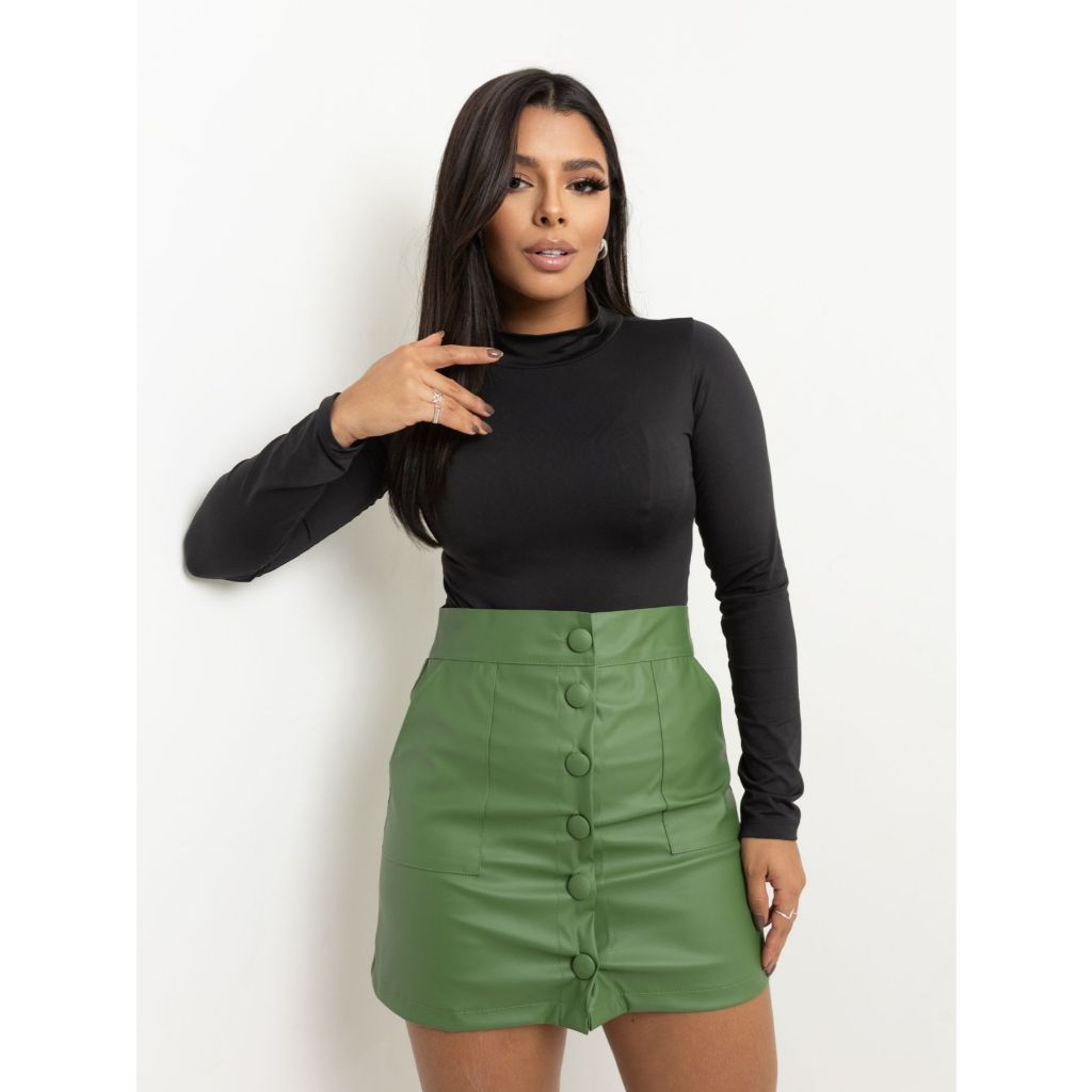 Saia Curta Feminina Couro Fake Botão E Bolso Frontal
