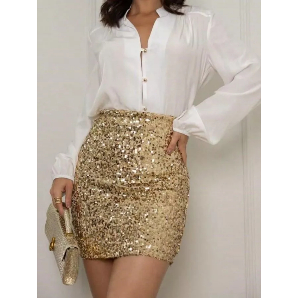 SAIA CURTA PAETE GOLD FEMININA BRILHO MODA FESTA ELEGANTE
