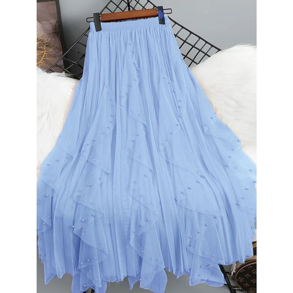 Saia de tule com contas irregulares para mulheres 2025 nova saia plissada com cintura elástica e comprimento médio