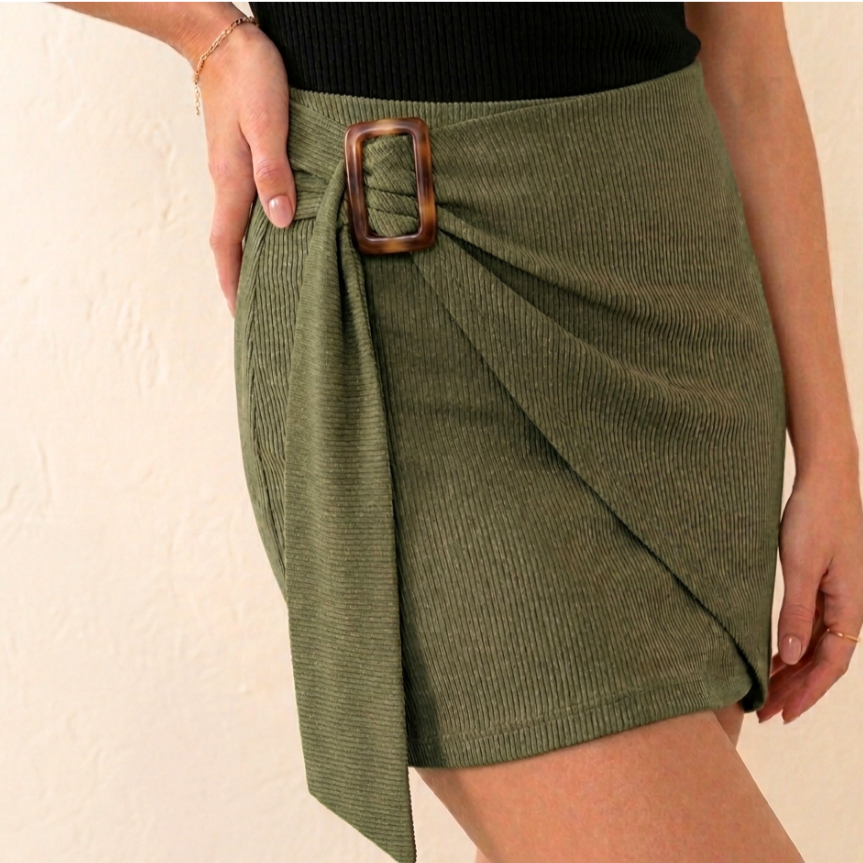 Saia Feminina Curta Transpassada Elastano Canelada Com Fivela Casual Premium Elegante Fashion