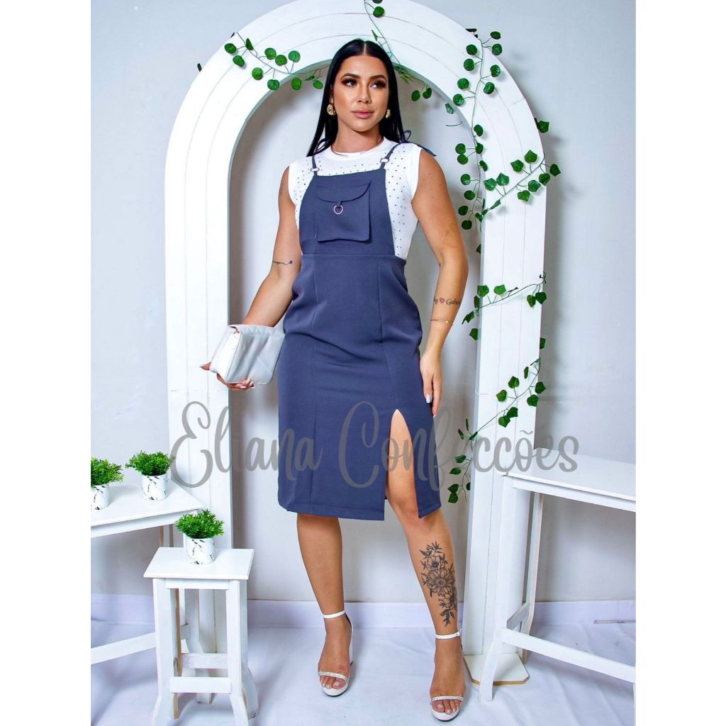 Saia jardineira com fenda na lateral com alça regulavel e bolso na frente - eliana confeccçoes black fraday*