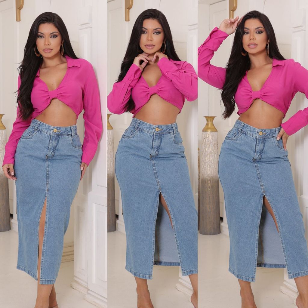 Saia Jeans Feminina Longa com Fenda Midi Comprida Cintura Alta Marmorizada Premium Super na Moda
