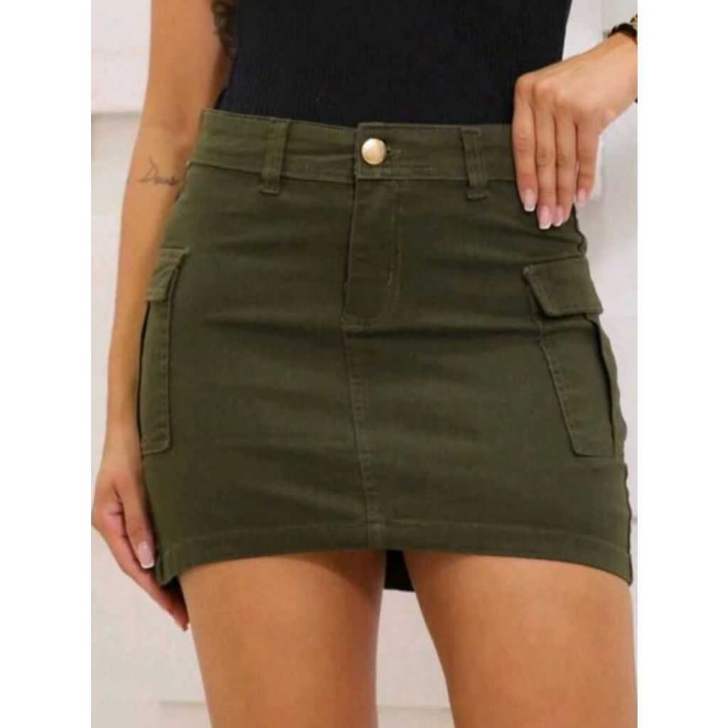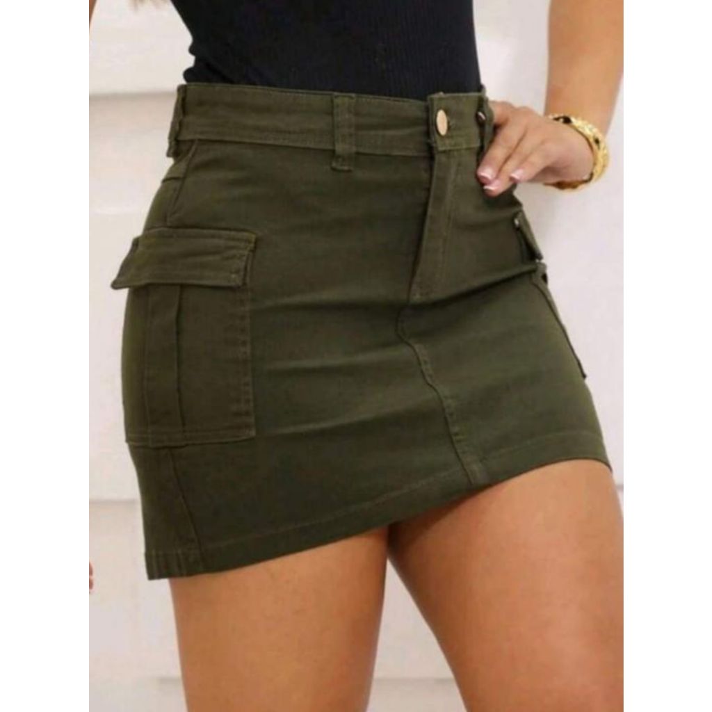 Saia jeans feminino cargo verde oliva levanta bumbum.