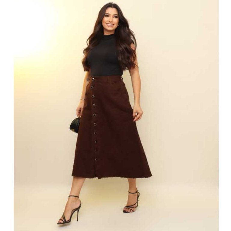 Saia Jeans Longa Elegante Evangélica Botões Cintura Alta Marrom Escuro Bolsos Cristã