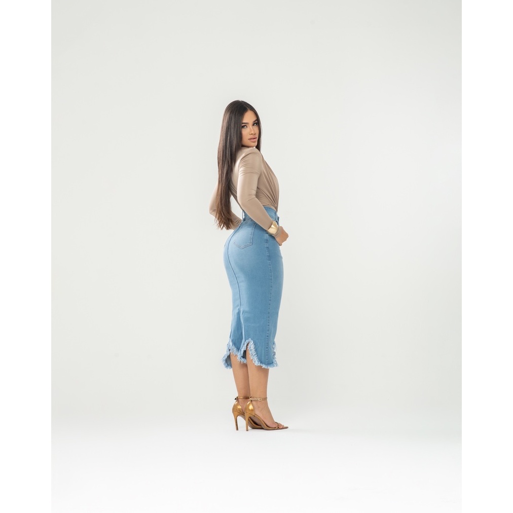 SEJA BEM VINDO A IMPÉRIO DAS SAIAS AQUI VOCÊ VAI ENCONTRAR UMA GRANDE VARIEDADE DE ARTIGOS NO JEANS DE ALTA QUALIDADE NA MODA EVANGÉLICA. QUEM SOMOS? SOMOS UMA EMPRESA CONSOLIDADA NO MERCADO DE VENDAS, QUE SE PREOCUPA COM O VESTIR BEM DA MULHER EVANGÉLICA, ABRILHANTANDO O LOOK DA MULHER CRISTÃ, ATRAVÉS DE LINDOS MODELOS QUE VOCÊ SÓ ENCONTRA AQUI. DÚVIDAS FREQUENTES: ESSE MODELO TEM LICRA / ELASTANO? SIM, 73% ALGODÃO, 24% POLIÉSTER E 3% ELASTANO. QUAL O PRAZO DE ENTREGA? APÓS A CONCLUSÃO DO SEU PEDIDO, PROVIDENCIAMOS O PREPARO E DESPACHO NO MESMO DIA, EXCETO OS PEDIDOS REALIZADOS NA SEXTA-FEIRA A TARDE (QUE SÃO DESPACHADOS NO 1º DIA ÚTIL). O PRAZO PARA A ENTREGA É DISPONIBILIZADO PELO SISTEMA DA PLATAFORMA SHOPEE. DESCRIÇÃO DA PEÇA: A SAIA POSSUI BOTÕES FRONTAIS FORRADOS, BARRA DESFIADA COM RECORTE ASSIMÉTRICO, POSSUI BOLSOS TRASEIROS E COMPRIMENTO MIDI.